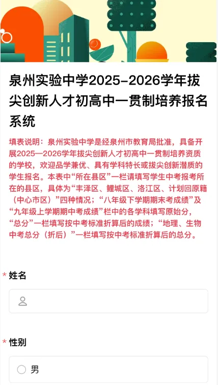 即日起,有意向者可微信识别下方二维码,进入“泉州实验中学2025-2026学年拔尖创新人才初高中一贯制培养报名系统”,按要求如实填写并提交预报名信息。👇