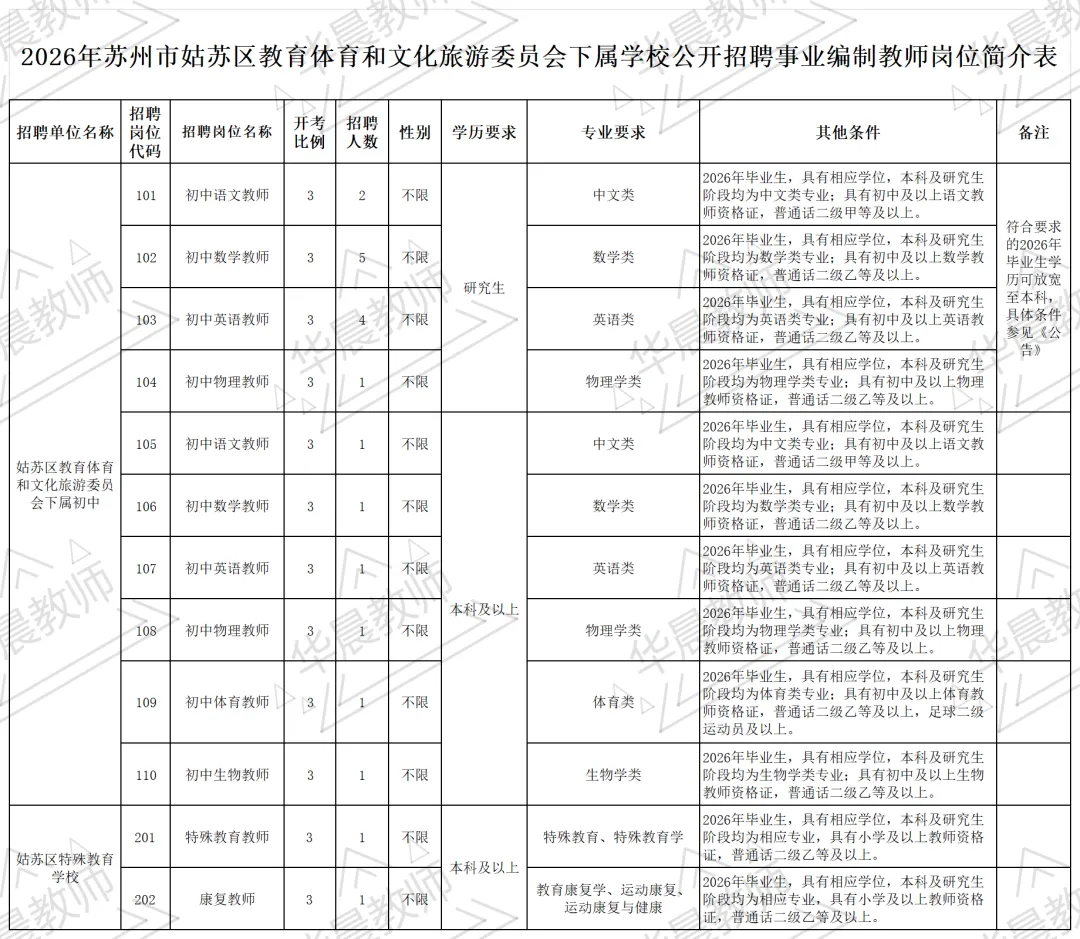 招聘岗位及具体条件等详见《2026年苏州市姑苏区教育体育和文化旅游委员会下属学校公开招聘事业编制教师岗位简介表》(附件1)。