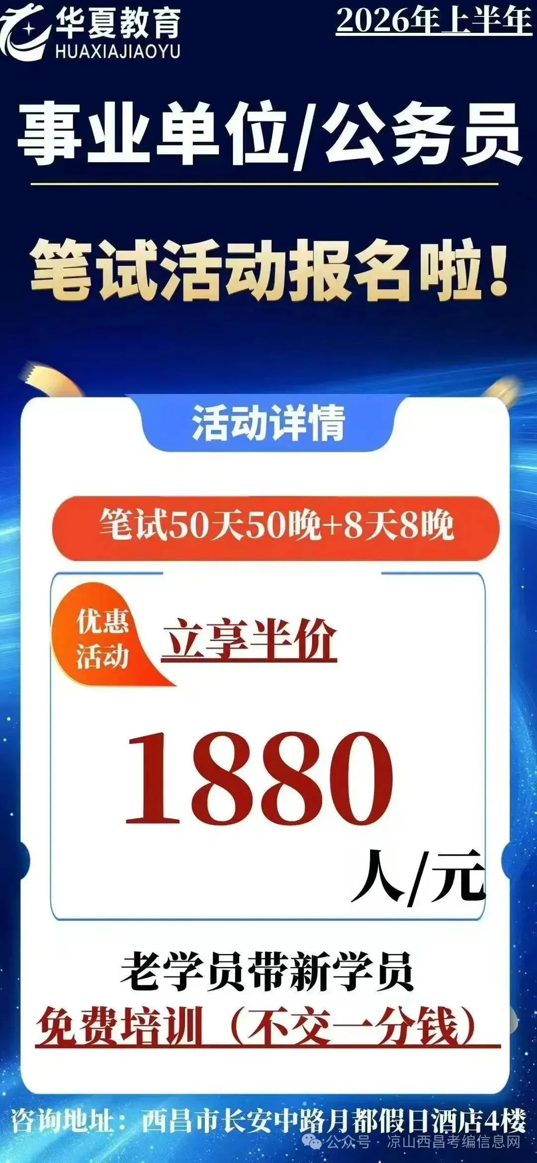 1.网络报考者在以下网址https://www.xichangrencai.com/如实填写自己的报名信息,如隐瞒有关情况或提供虚假信息的,一经查实,一律取消报考、聘用资格,一切责任由本人承担。请在2026年1月12日20:00之前完成缴费,逾期视为自动放弃。