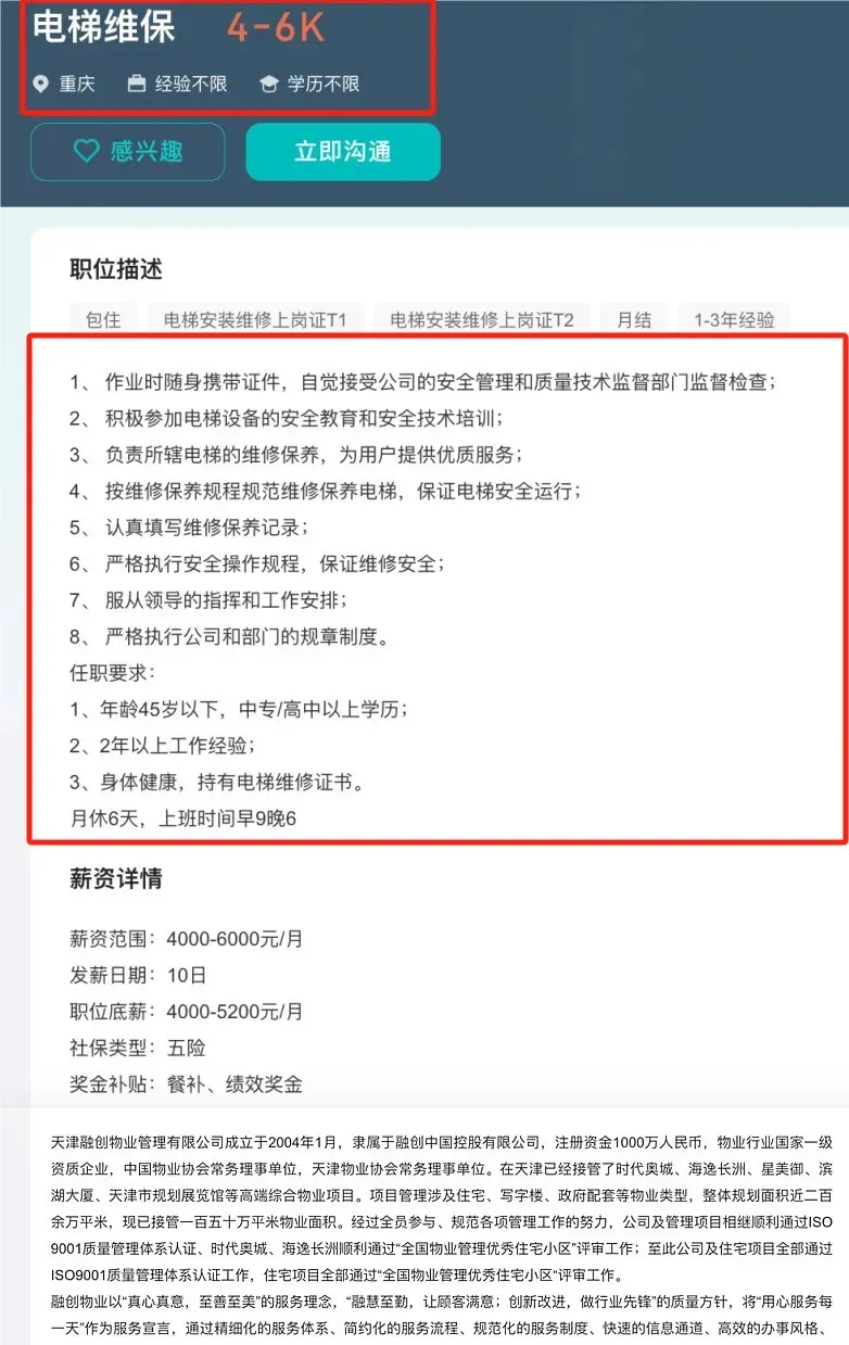 日前一则知名物业企业发布的招聘电梯维保驻场信息引起行业内广大电梯人热议。近年来,不少电梯维保都因为环境很艰苦纷纷跳槽。但是出来后,发现自己除了干电梯维保还是电梯维保。有人另辟蹊径:选择和知名物业大企业干回自己的老本行,但薪资待遇究竟如何呢?