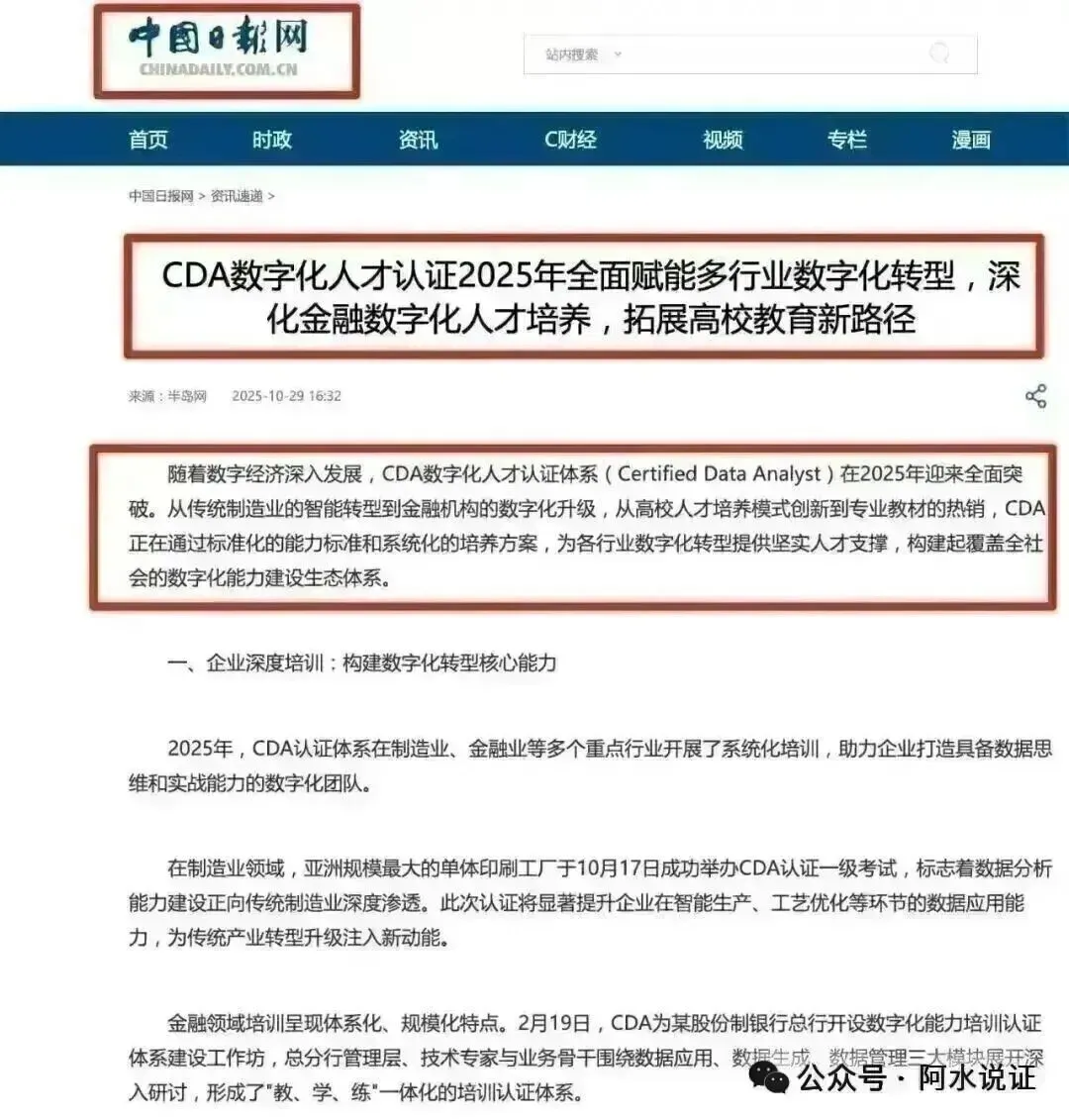 CDA数据分析师认证在业内知名度高,被人民日报、经济日报等权威媒体推荐,与CPA、CFA并列为财经、数据领域的高含金量证书。