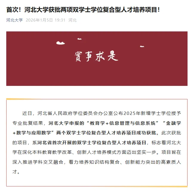 据河北大学官微消息,近日,河北省人民政府学位委员会办公室公布2025年新增学士学位授予专业批复结果,河北大学申报的“教育学+信息管理与信息系统”“金融学+数学与应用数学”两个双学士学位复合型人才培养项目成功获批。