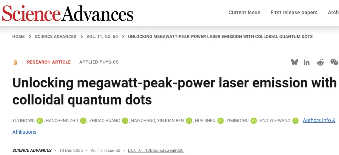 Yuting Wu et al., Unlocking megawatt-peak-power laser emission with colloidal quantum dots. Sci. Adv.11, eaea8326(2025). DOI:10.1126/sciadv.aea8326