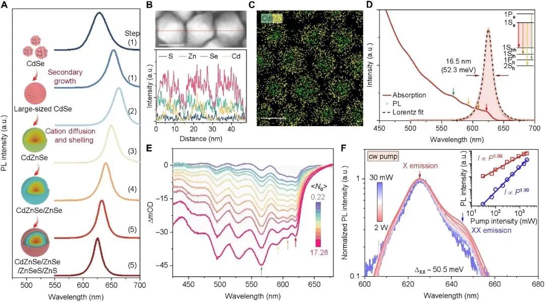 南京理工大学材料学院王跃、南京邮电大学任银娟团队报道了一种基于胶体量子点的激光器,首次实现了兆瓦级峰值功率输出。通过设计具有窄发射线宽(16.5 nm)和大双激子结合能(50.5 meV)的三元量子点(CdZnSe/ZnSe/ZnSeS/ZnS),并结合瞬态光谱与理论模拟,证实其具备亚单激子增益阈值和创纪录的高饱和增益截面。