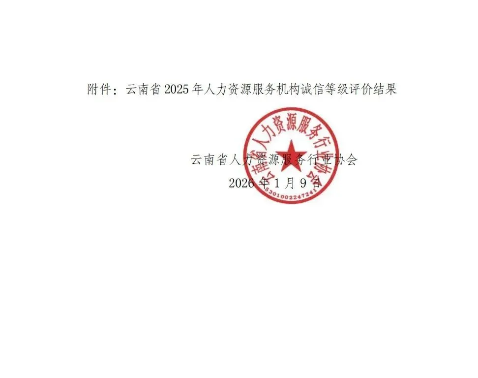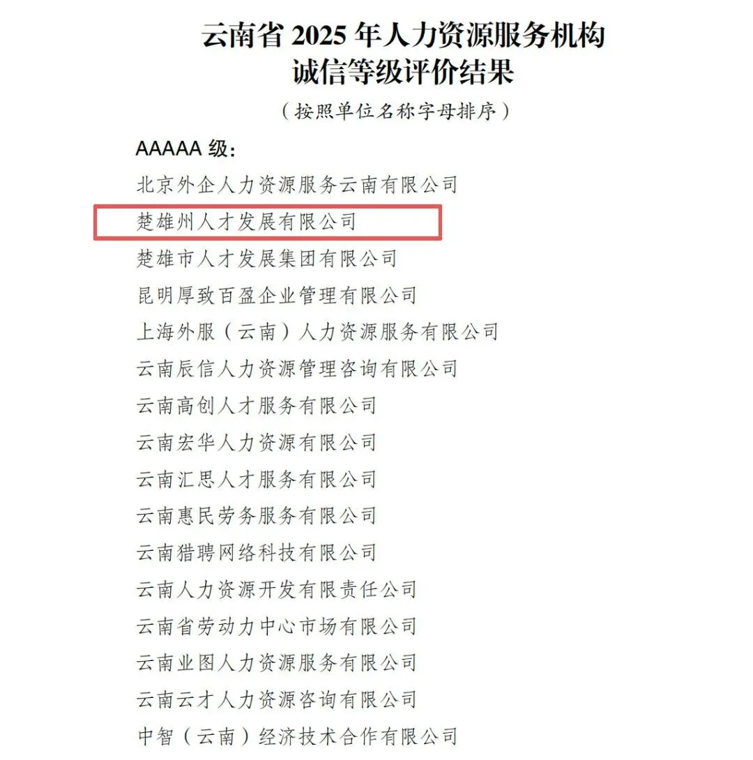 在云南省2025年人力资源服务机构诚信评价中,楚雄州人才发展有限公司凭借规范的服务体系、健全的管理制度与良好的行业口碑,成功斩获AAAAA级(最高等级)诚信机构荣誉!