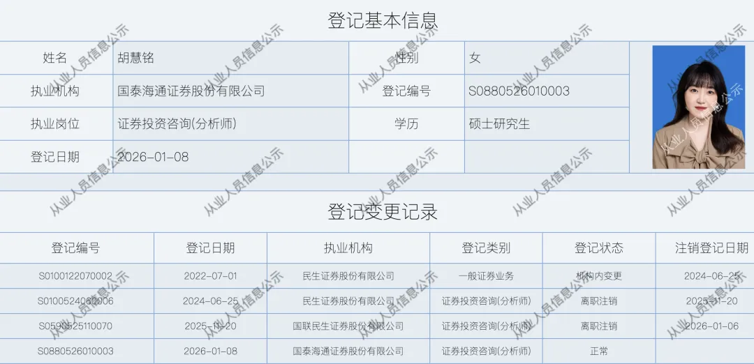 胡慧铭 国联民生原食品饮料行业分析师。1月6日注销了在国联民生的执业登记,1月8日就登记为国泰海通证券了。