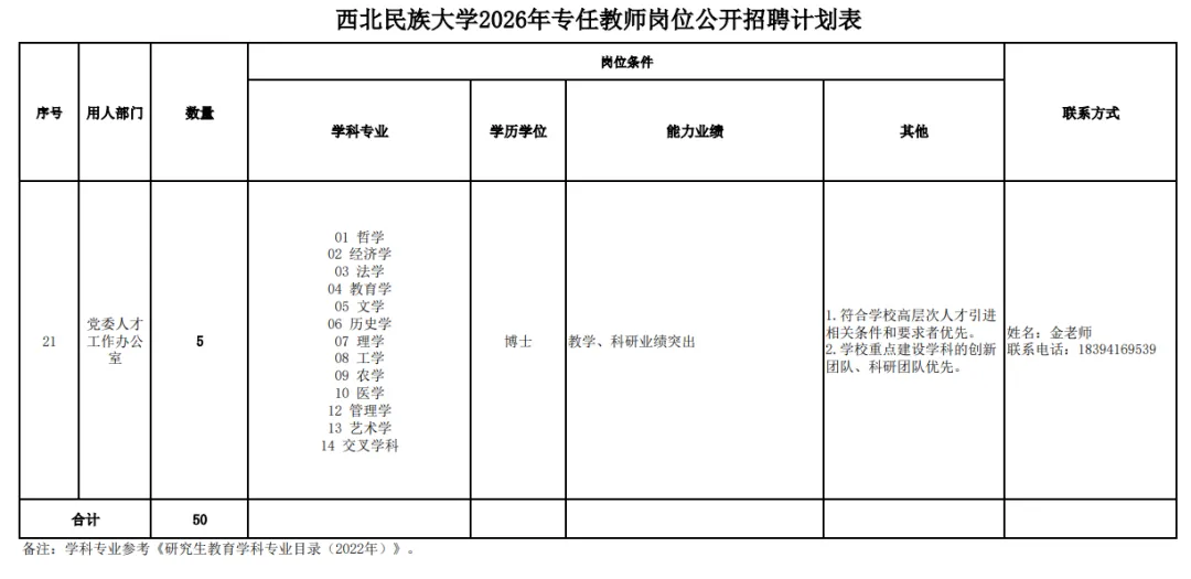 专任教师岗位50个,招聘岗位信息详见《西北民族大学2026年专任教师岗位公开招聘计划表》(附件1)。
