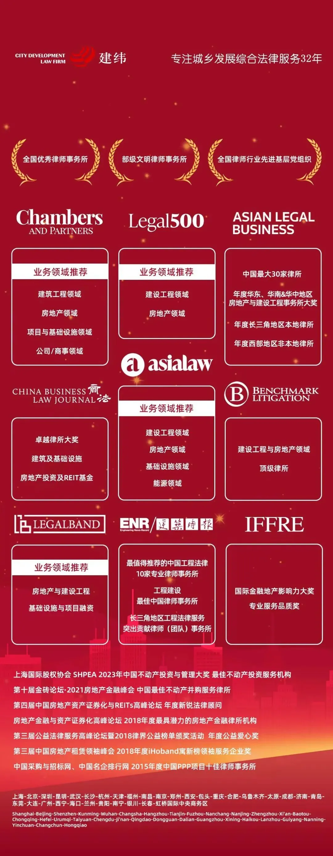 建纬成立至今,始终秉持着“超前、务实、至诚、优质”的服务理念,以全链条、精细化专业服务,成为专业化律所的标杆和典范。建纬凭借卓越的业绩表现,荣膺国内外多项殊荣,包括:全国优秀律师事务所、司法部部级文明律师事务所、钱伯斯建设工程、房地产、项目与基础设施、公司/商事领域领先律师事务所、ALB最大30家中国本土律所、《商法》建筑及基础设施、房地产投资及REIT基金领域卓越律所大奖等。