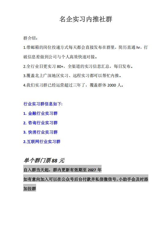 更多大厂实习在会员实习群内更新,实习群定期更新最新的招聘信息,岗位即时性都很高可以降低同质化竞争,群里招继任的岗位也可以互相内推简历。