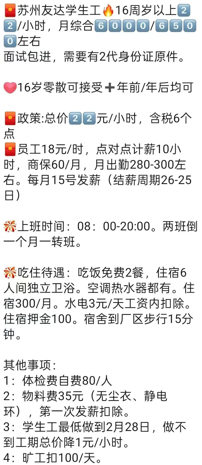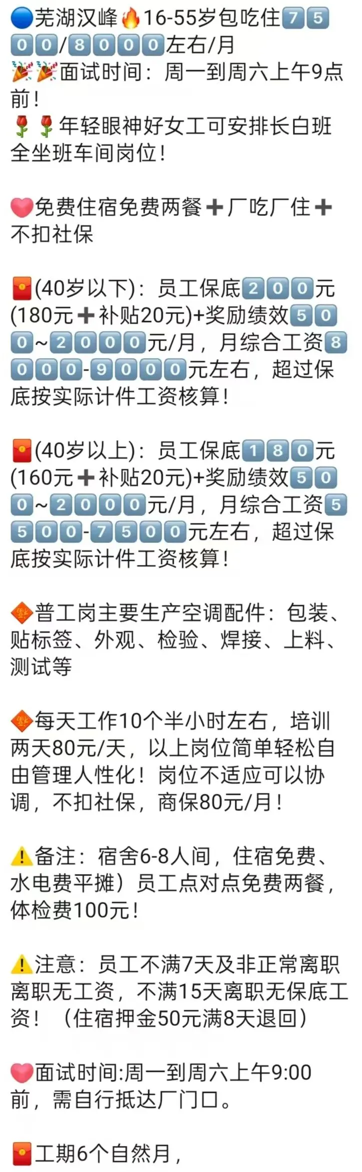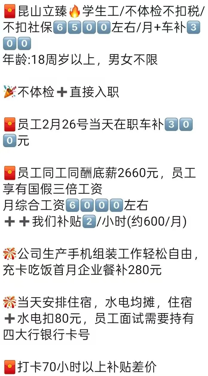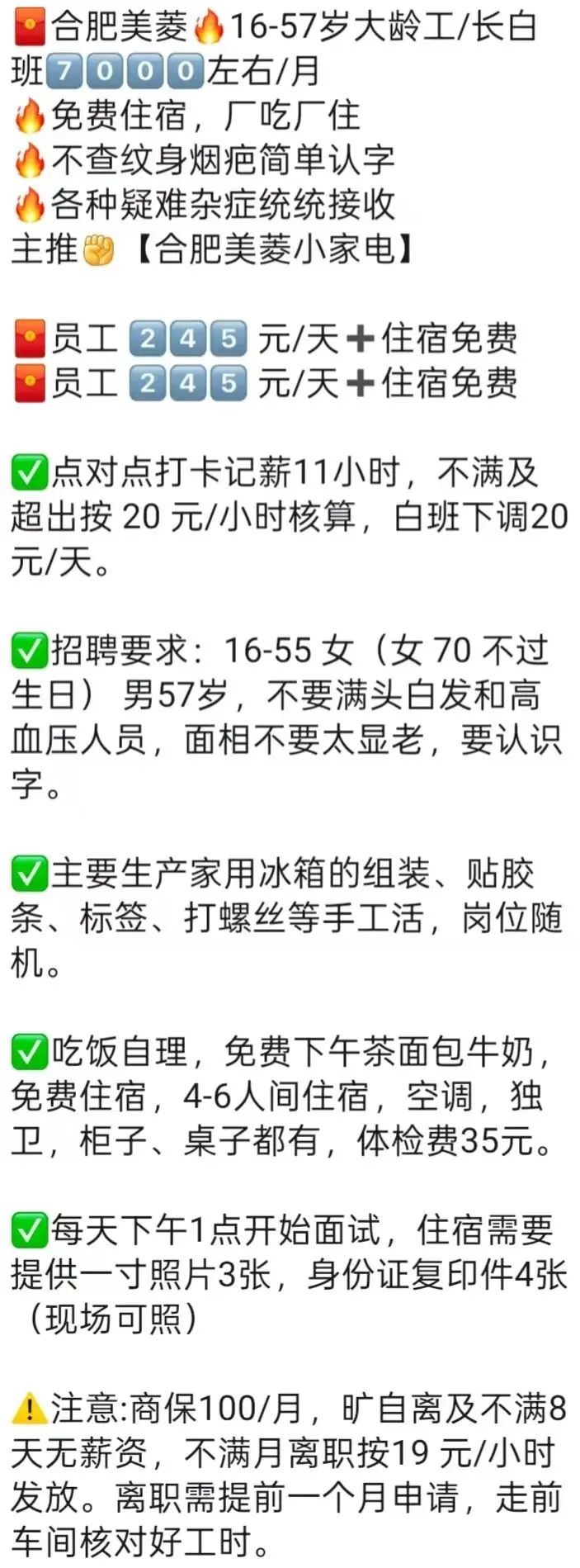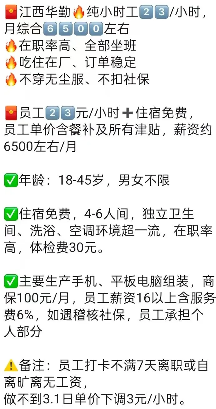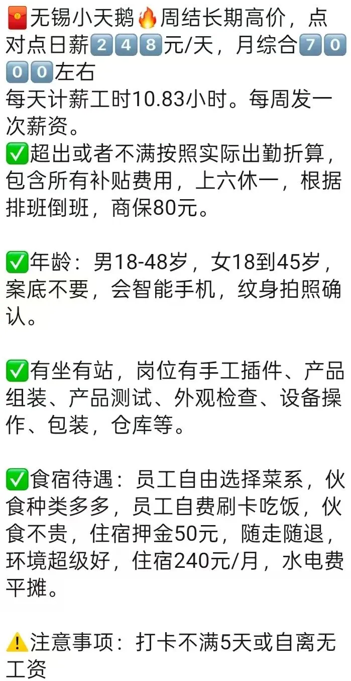 ⚠️面试需试岗2小时左右,试岗通过后可安排临时宿舍,试岗通过办理正式工宿舍(正式工宿舍四人间上床下桌)