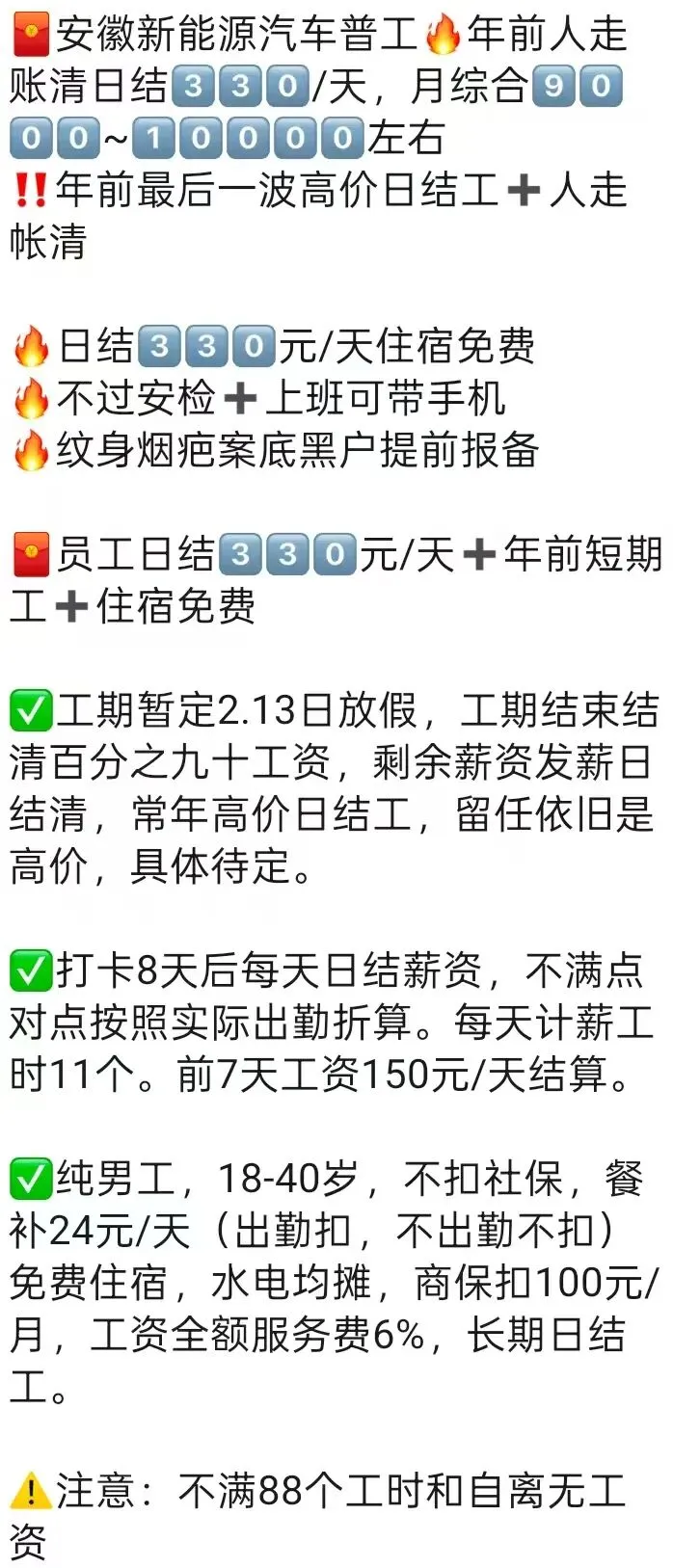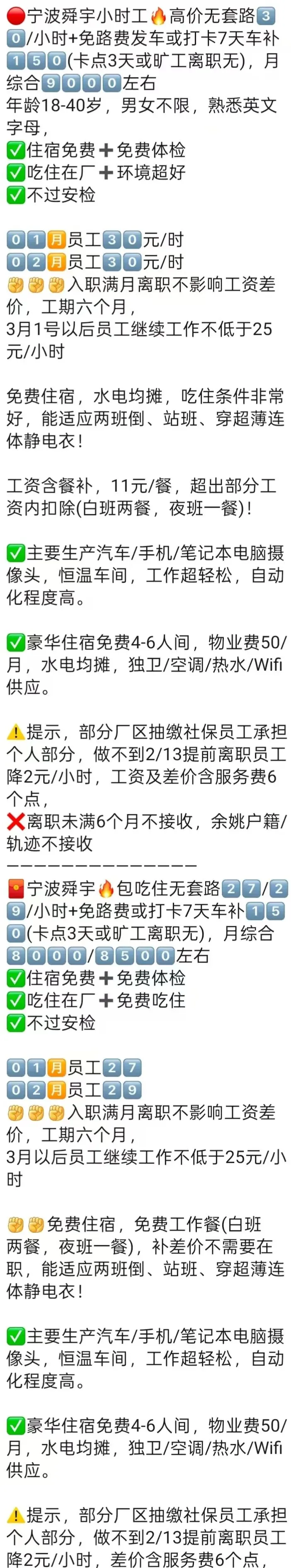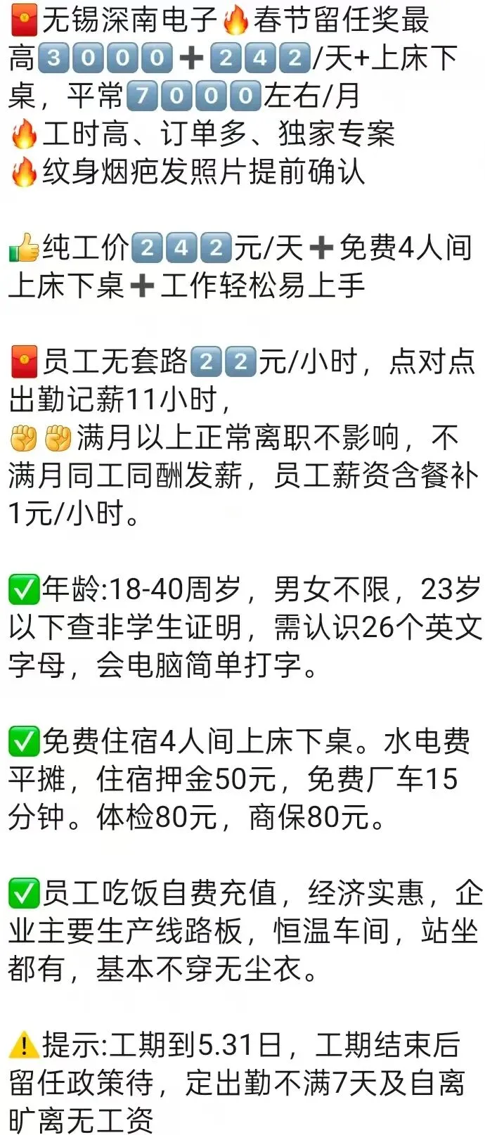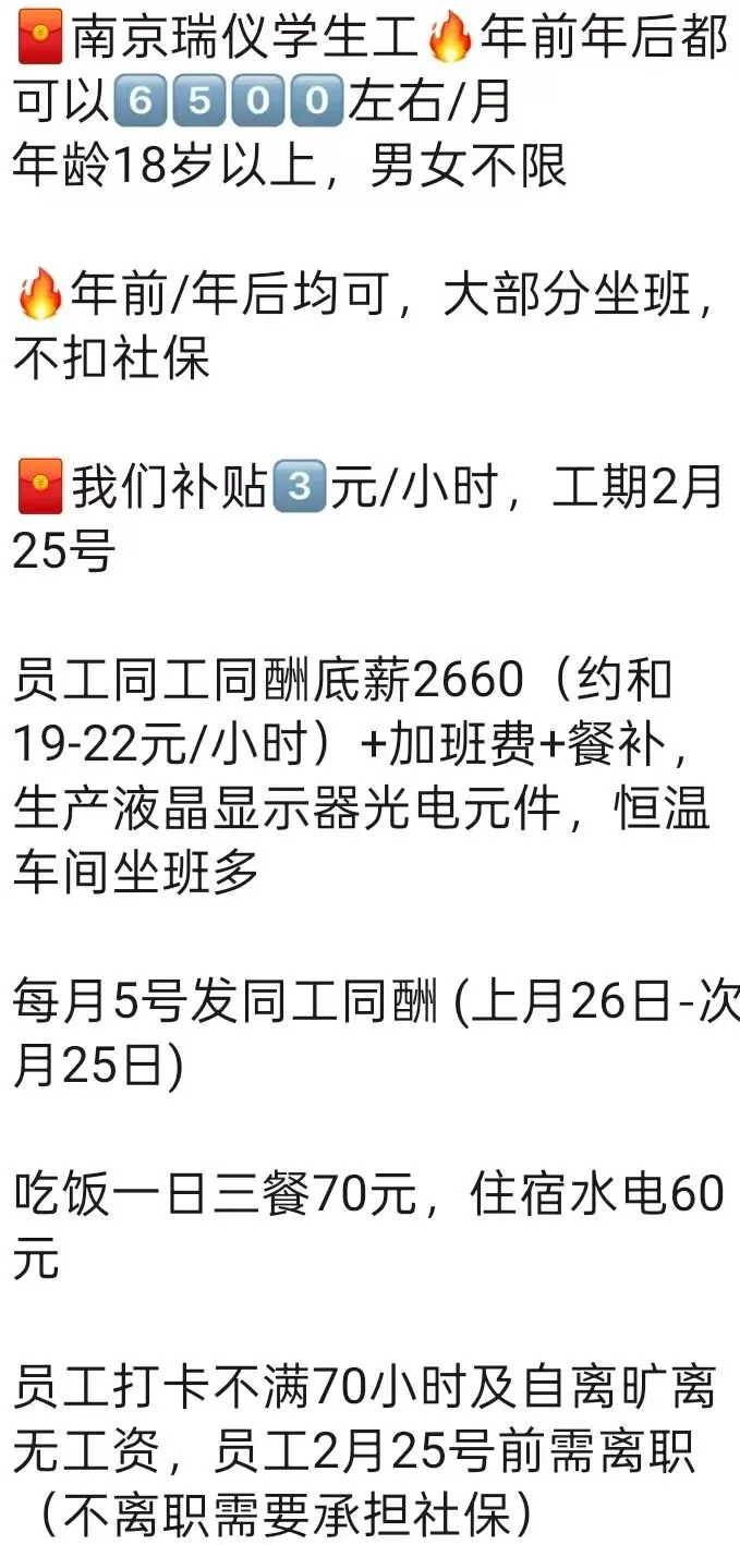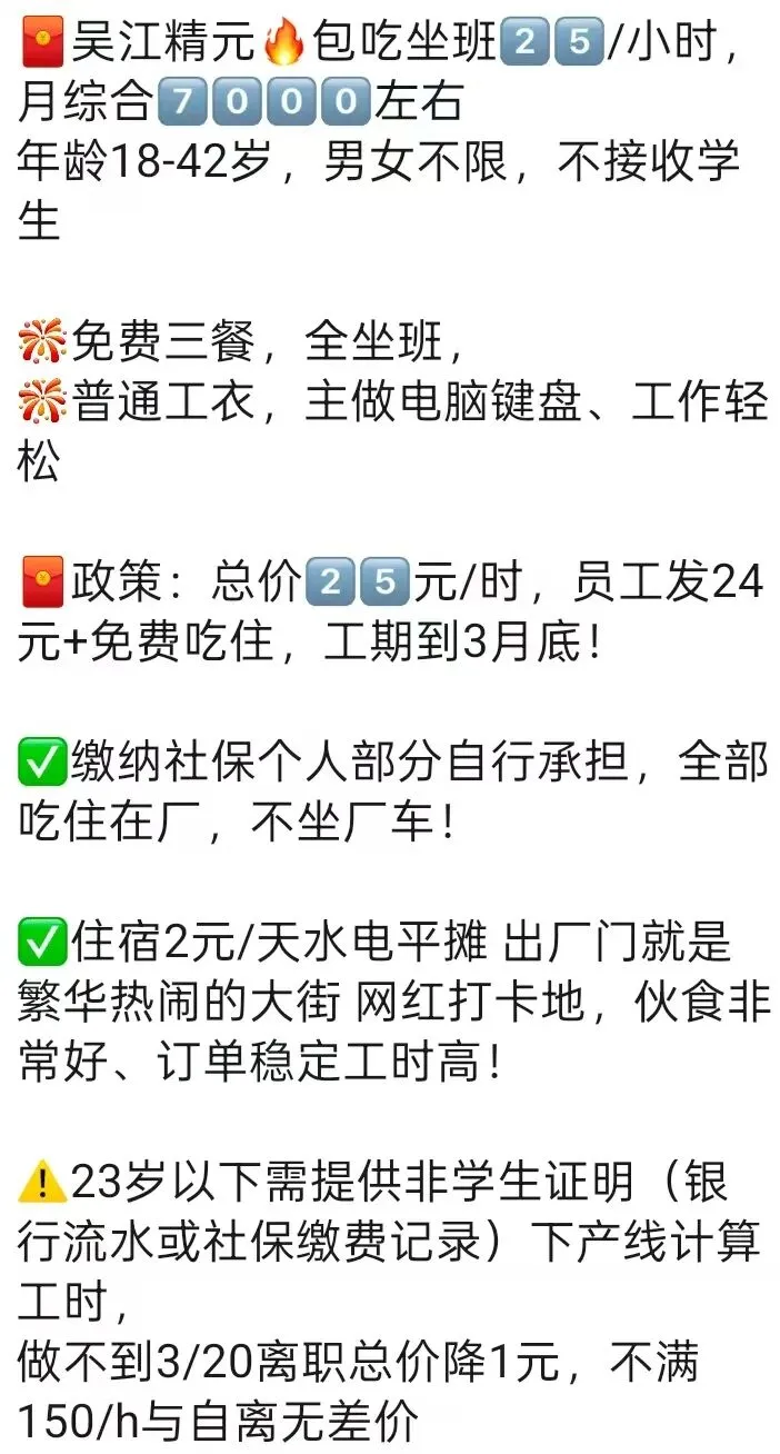 ⚠️面试需试岗2小时左右,试岗通过后可安排临时宿舍,试岗通过办理正式工宿舍(正式工宿舍四人间上床下桌)
