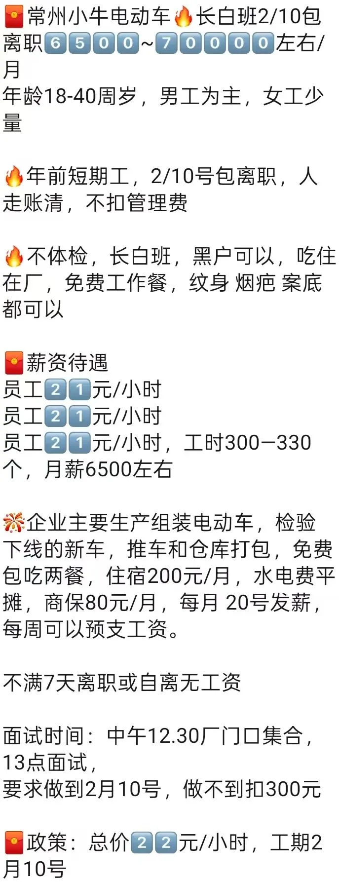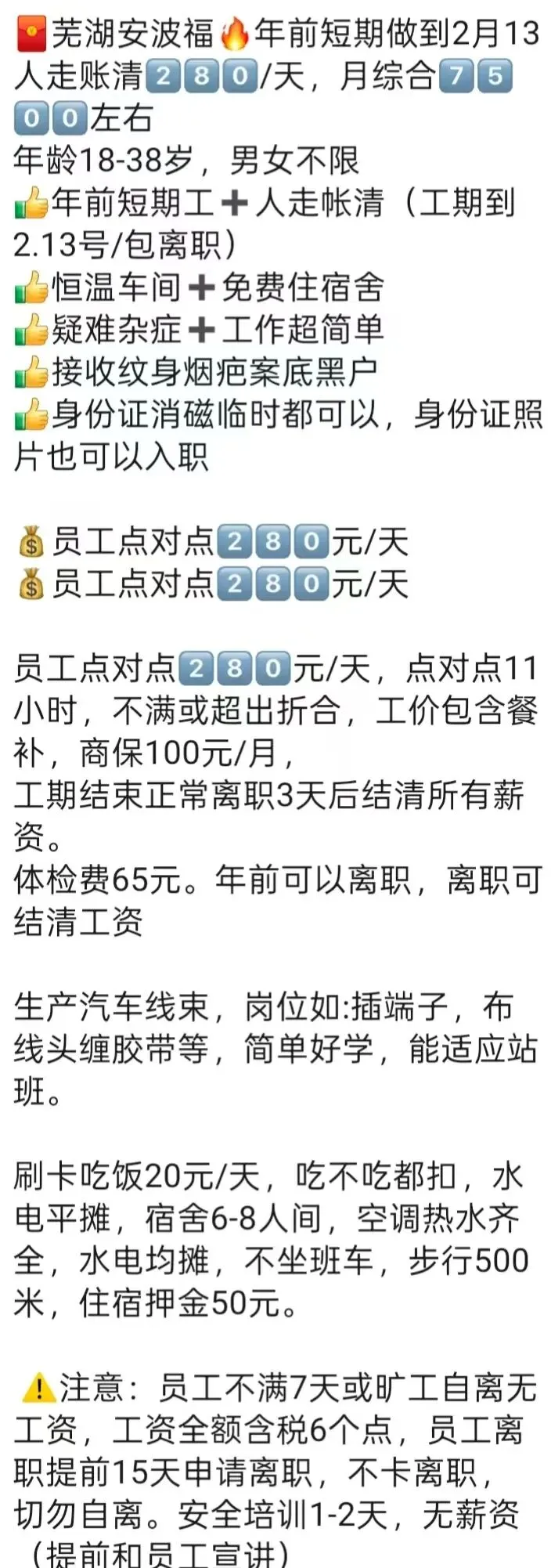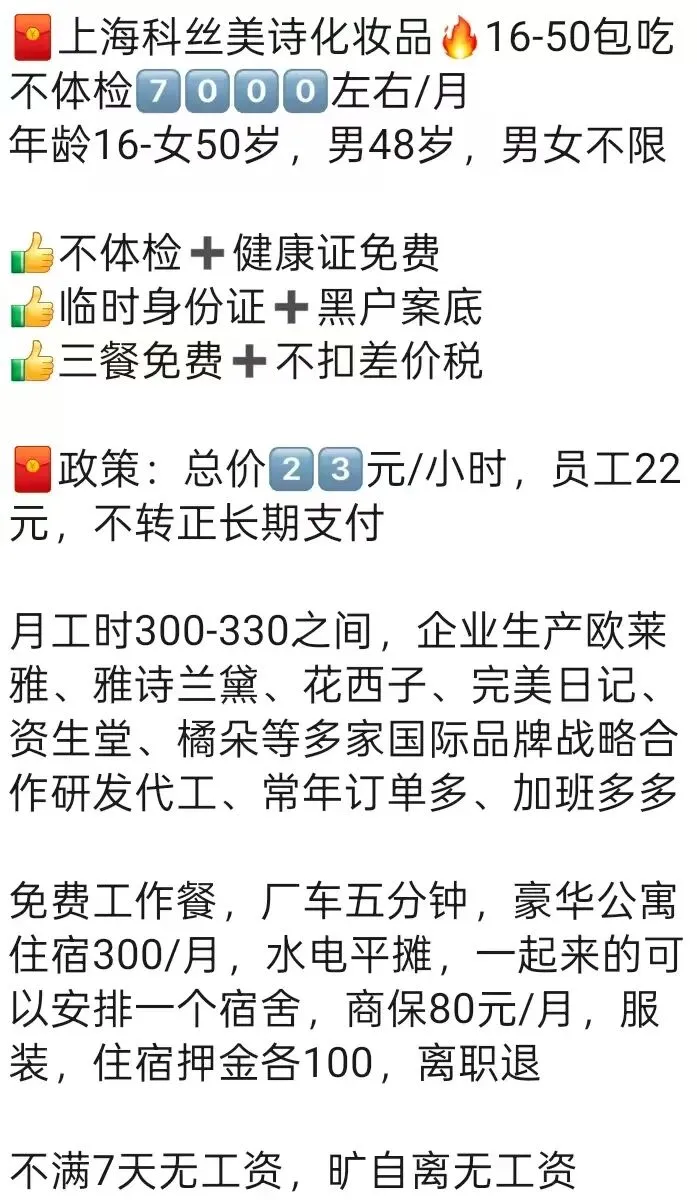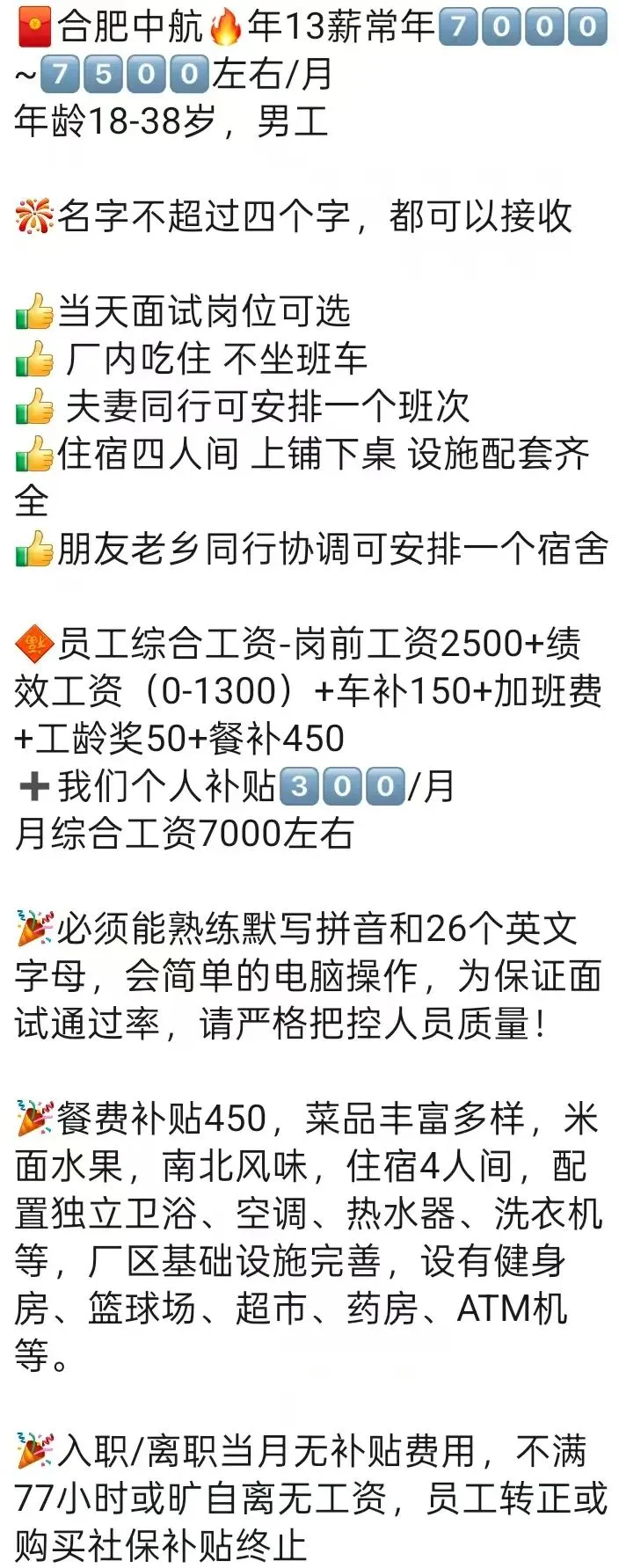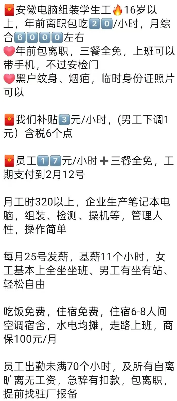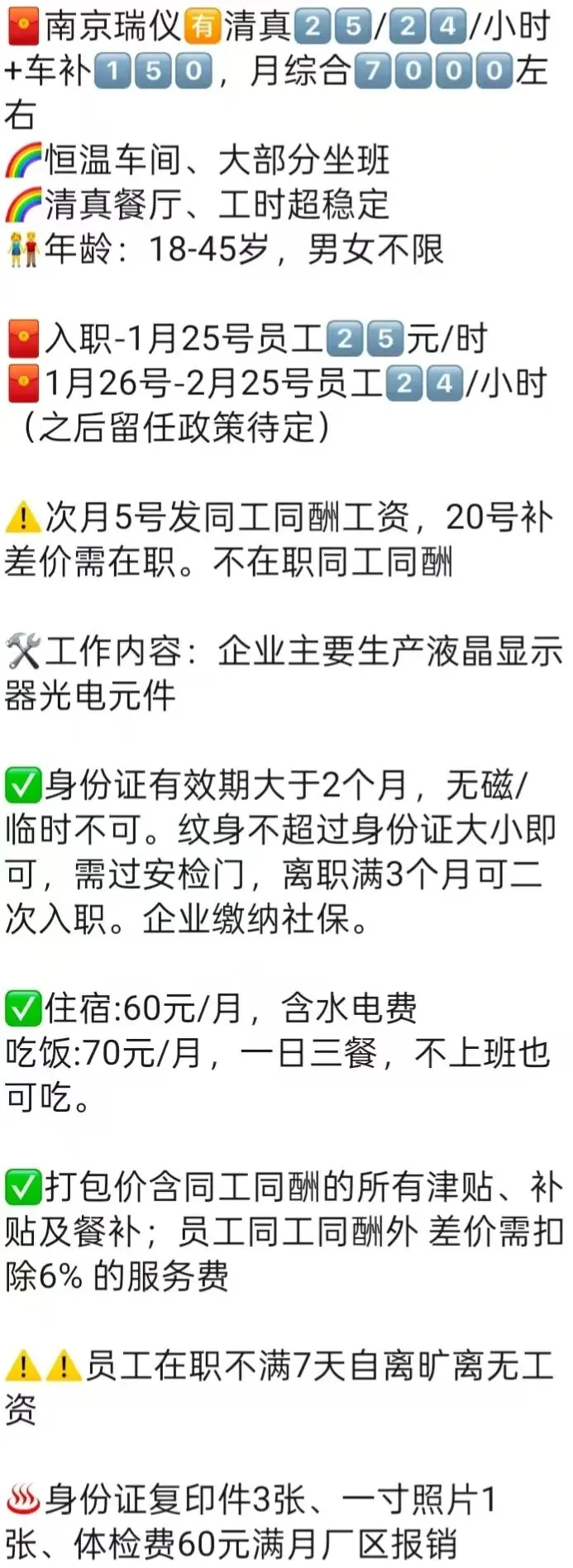 ⚠️面试需试岗2小时左右,试岗通过后可安排临时宿舍,试岗通过办理正式工宿舍(正式工宿舍四人间上床下桌)