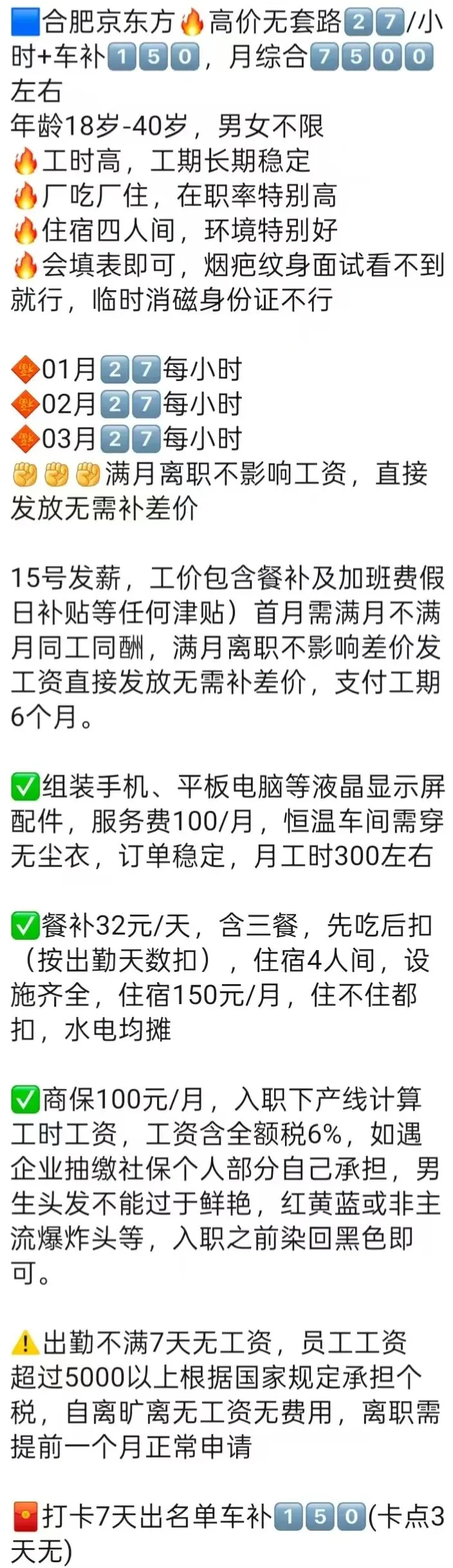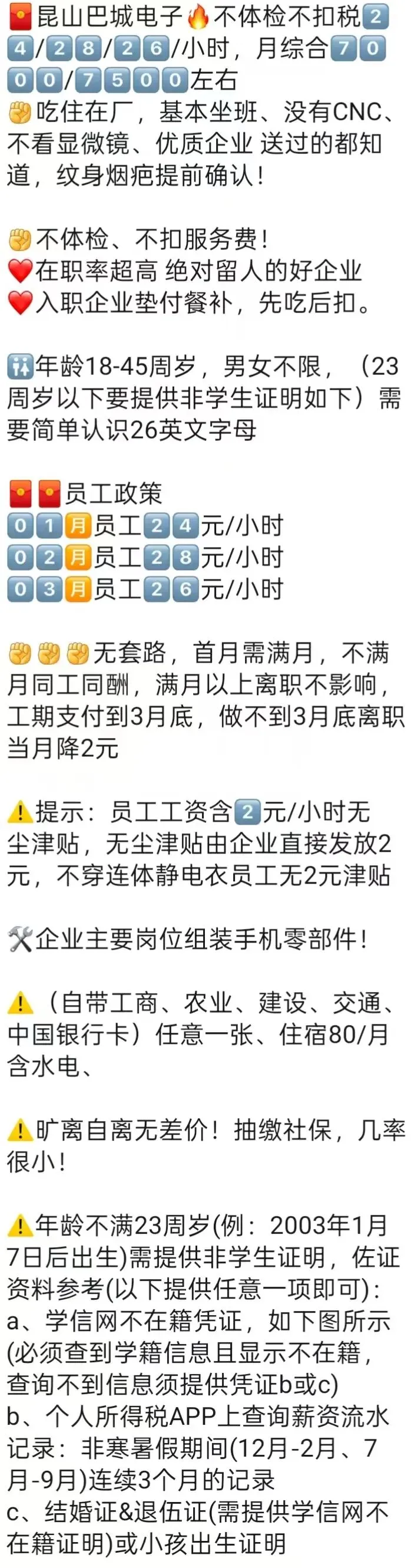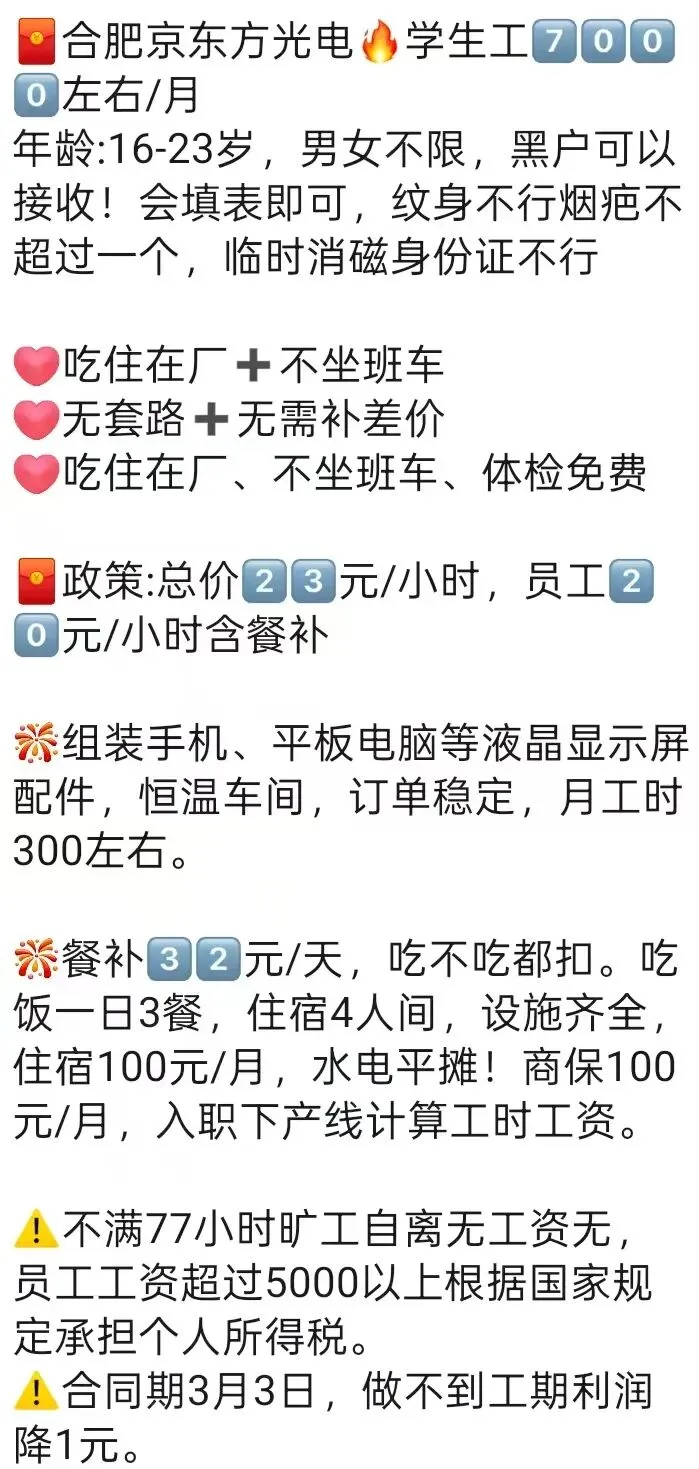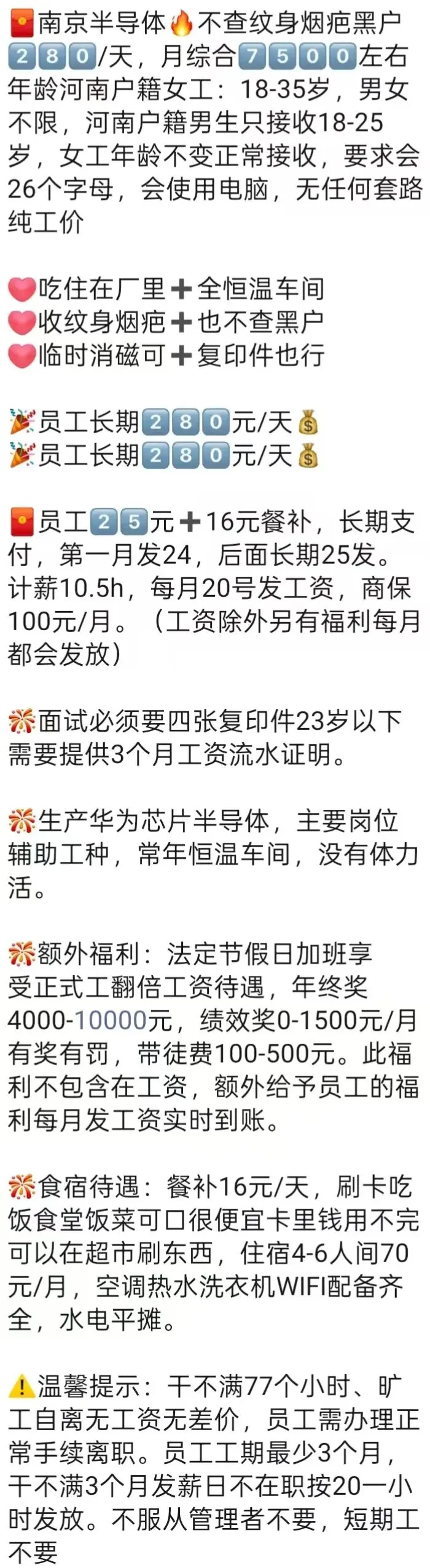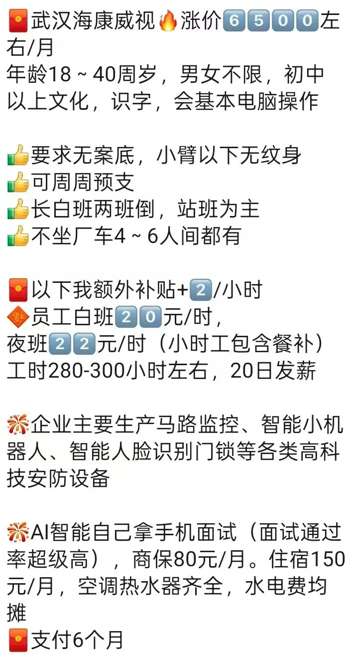 ⚠️面试需试岗2小时左右,试岗通过后可安排临时宿舍,试岗通过办理正式工宿舍(正式工宿舍四人间上床下桌)