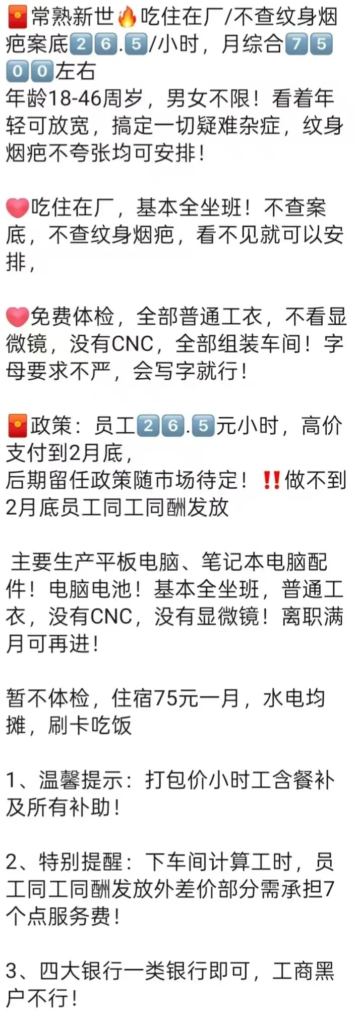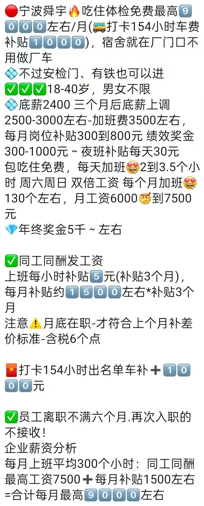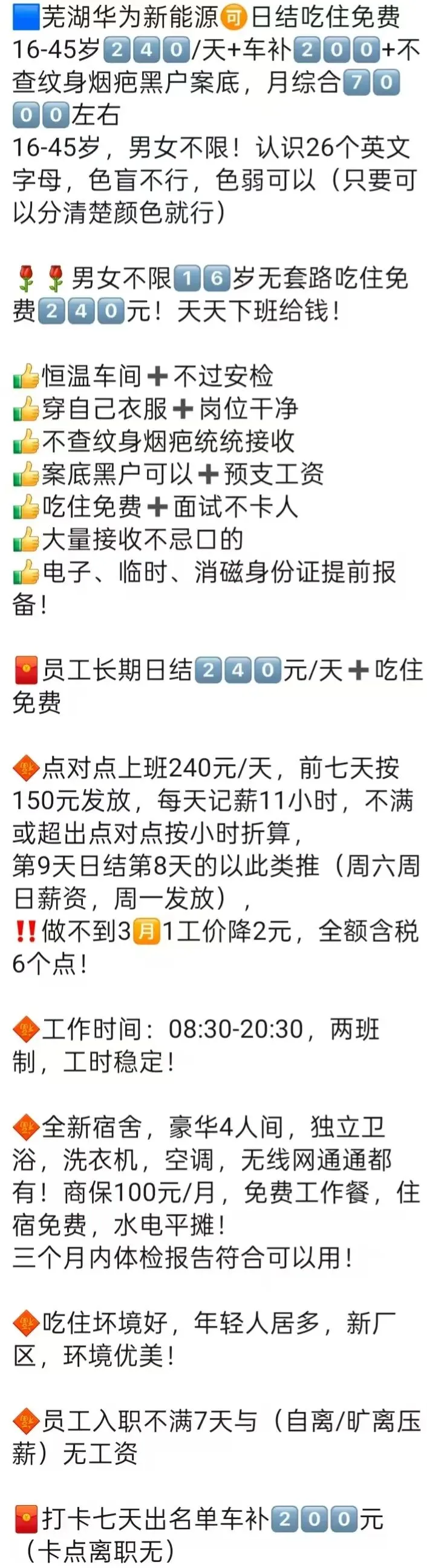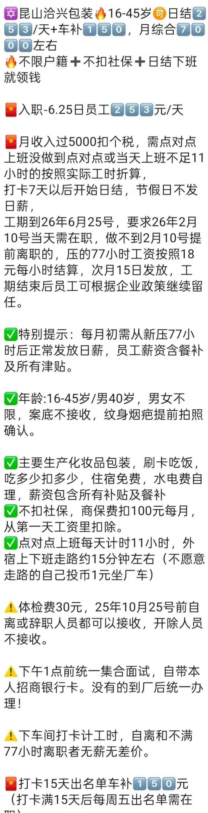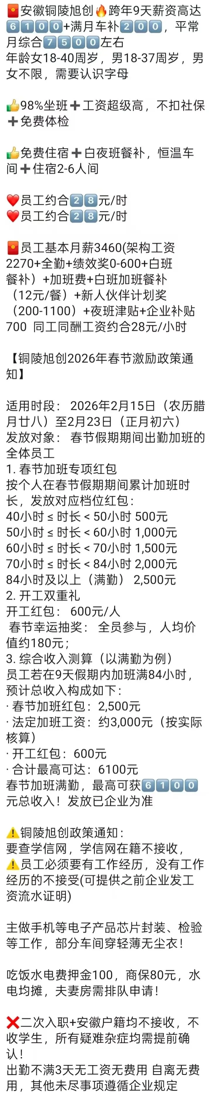 ⚠️面试需试岗2小时左右,试岗通过后可安排临时宿舍,试岗通过办理正式工宿舍(正式工宿舍四人间上床下桌)