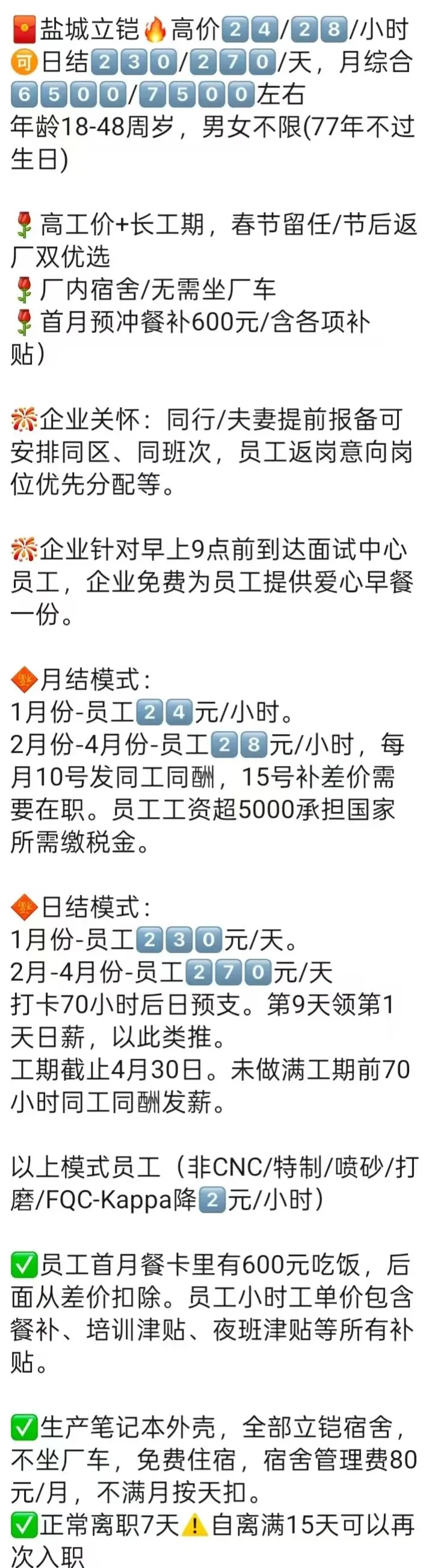 🧧食宿:管工作餐一顿(午饭),吃住在厂,额外补助: 根据当月出勤,月底人员在职,每天补贴5元餐补,补贴在餐卡里。