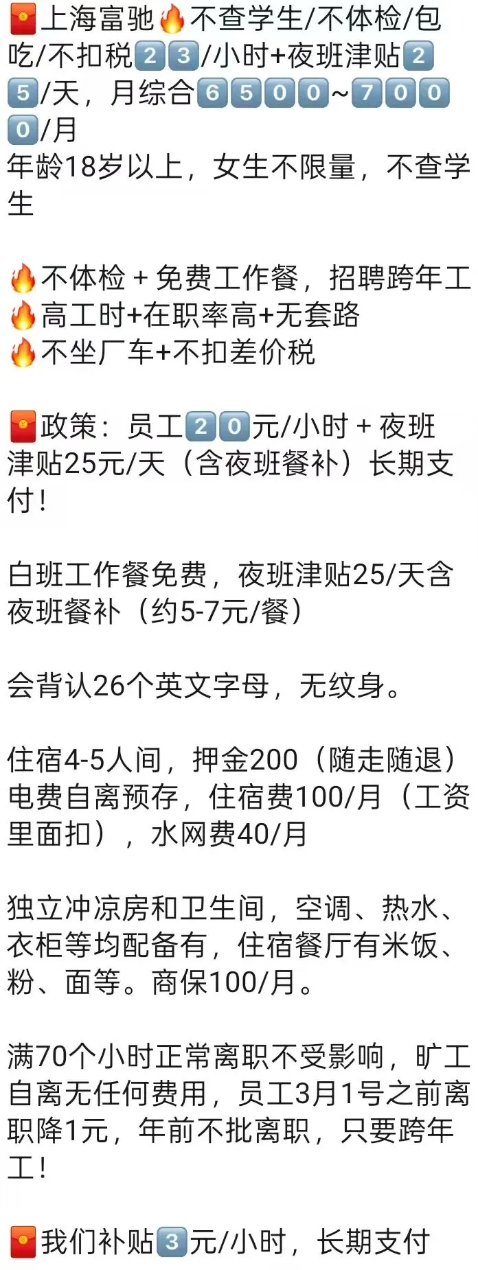 2、先吃后补,工作10小时以内补13块,10小时以上餐补26元,住宿收费180/月,水电费均摊,住宿和工装押金150元随走随退。