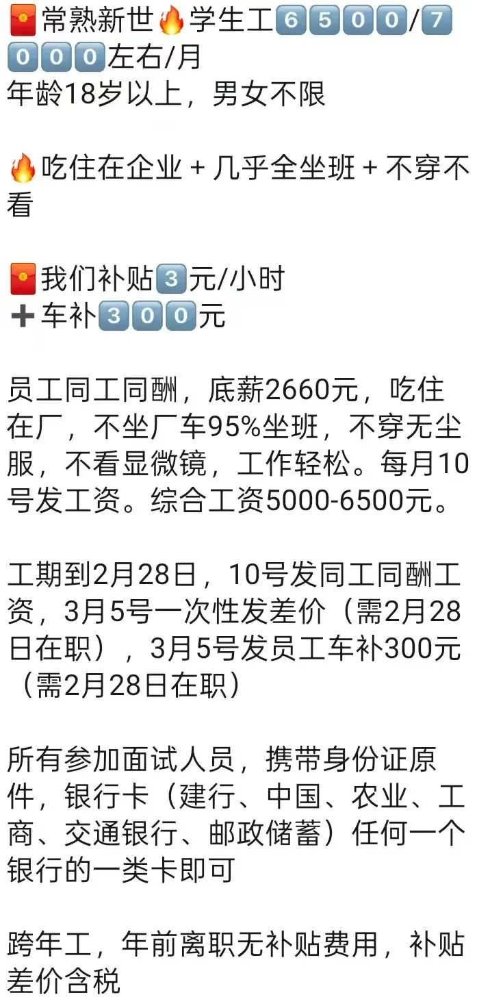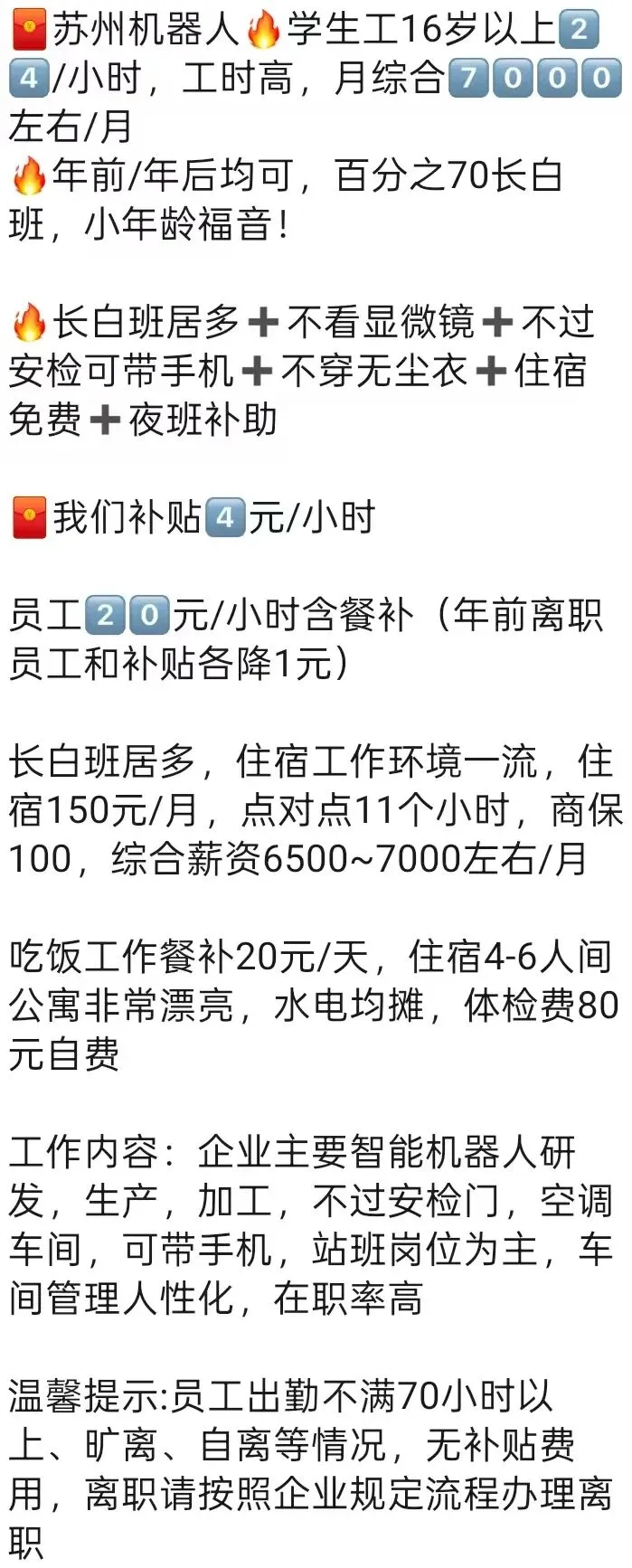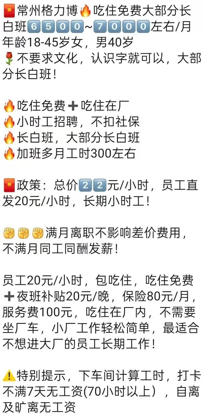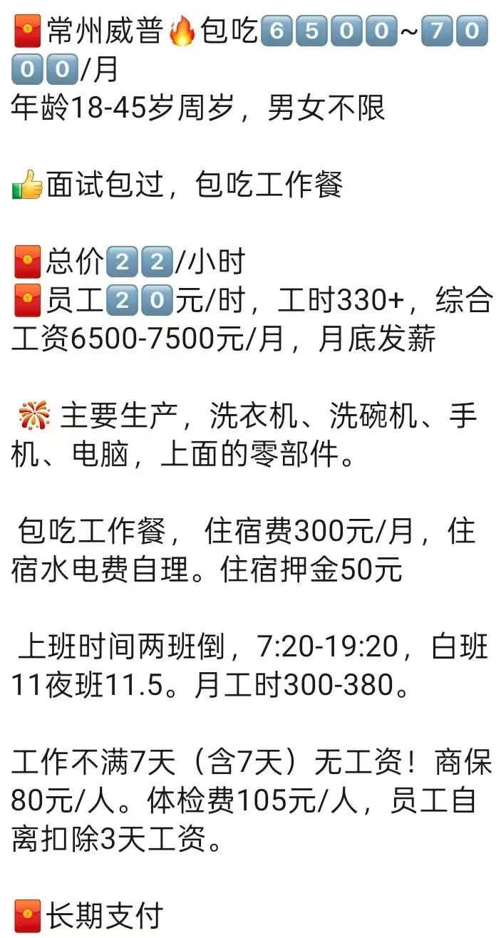 ️特别提醒:两班倒,12小时(包括吃饭时间),吃住在厂里,厂区位置好,周围有超市,饭店,娱乐很丰富