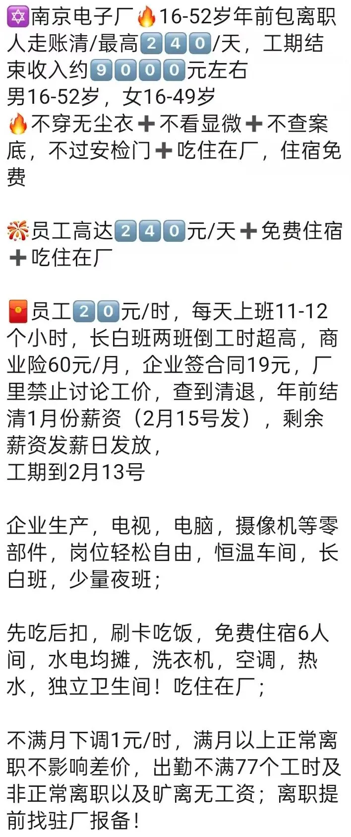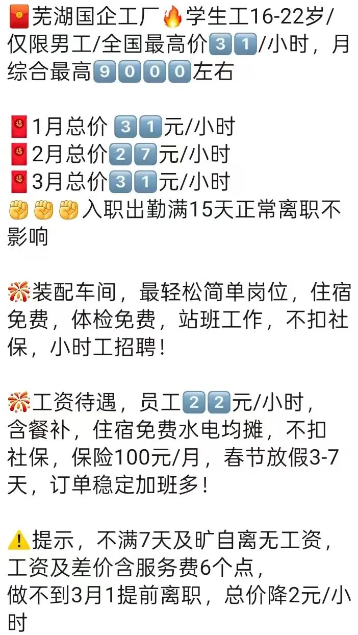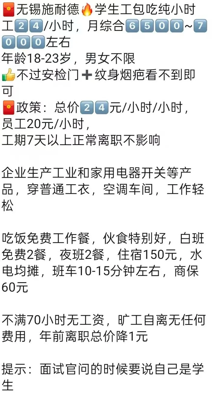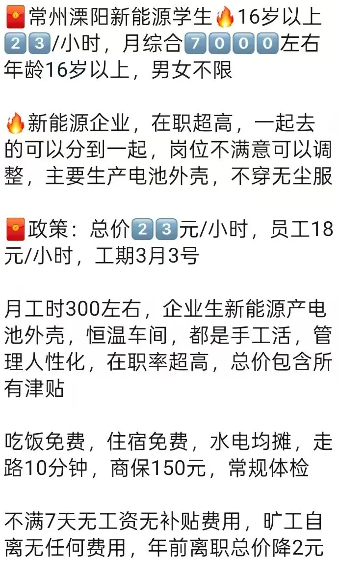 ️特别提醒:两班倒,12小时(包括吃饭时间),吃住在厂里,厂区位置好,周围有超市,饭店,娱乐很丰富
