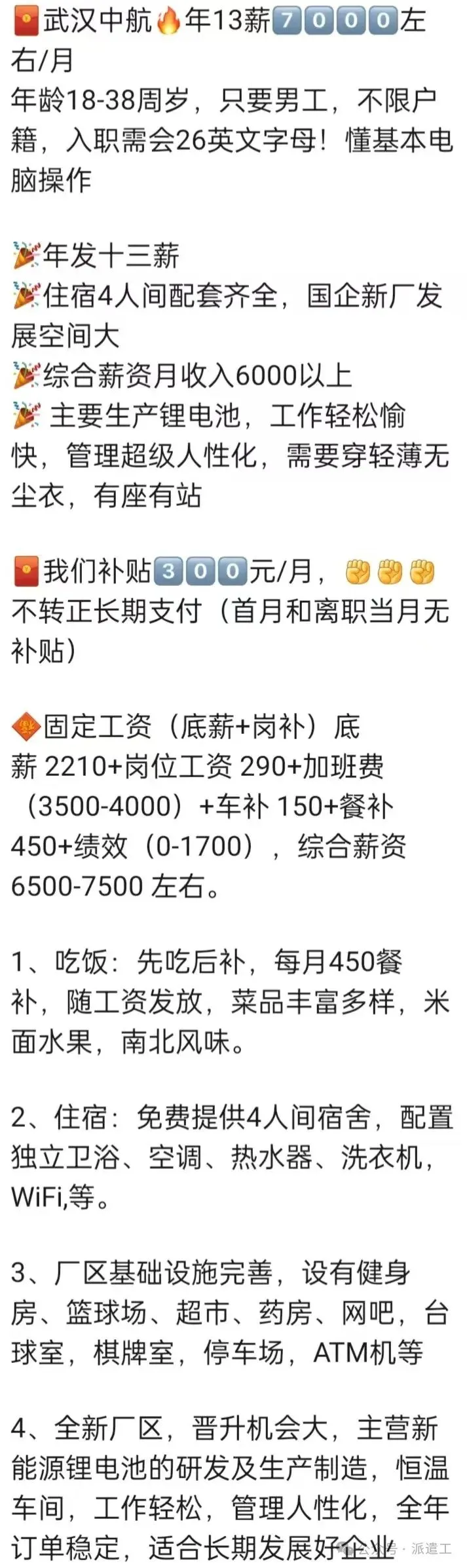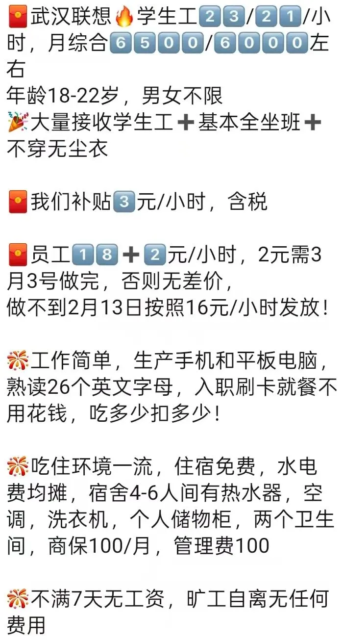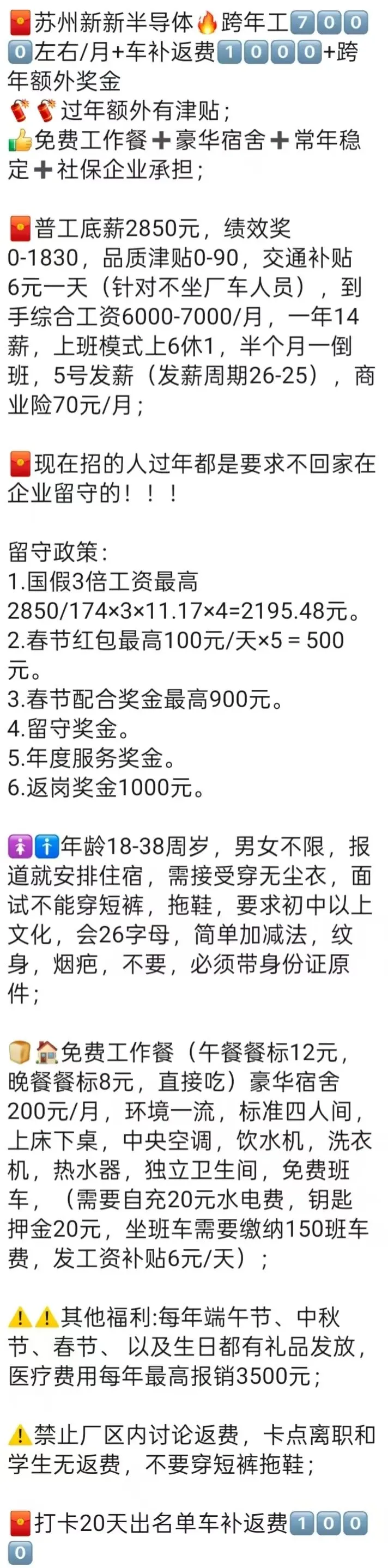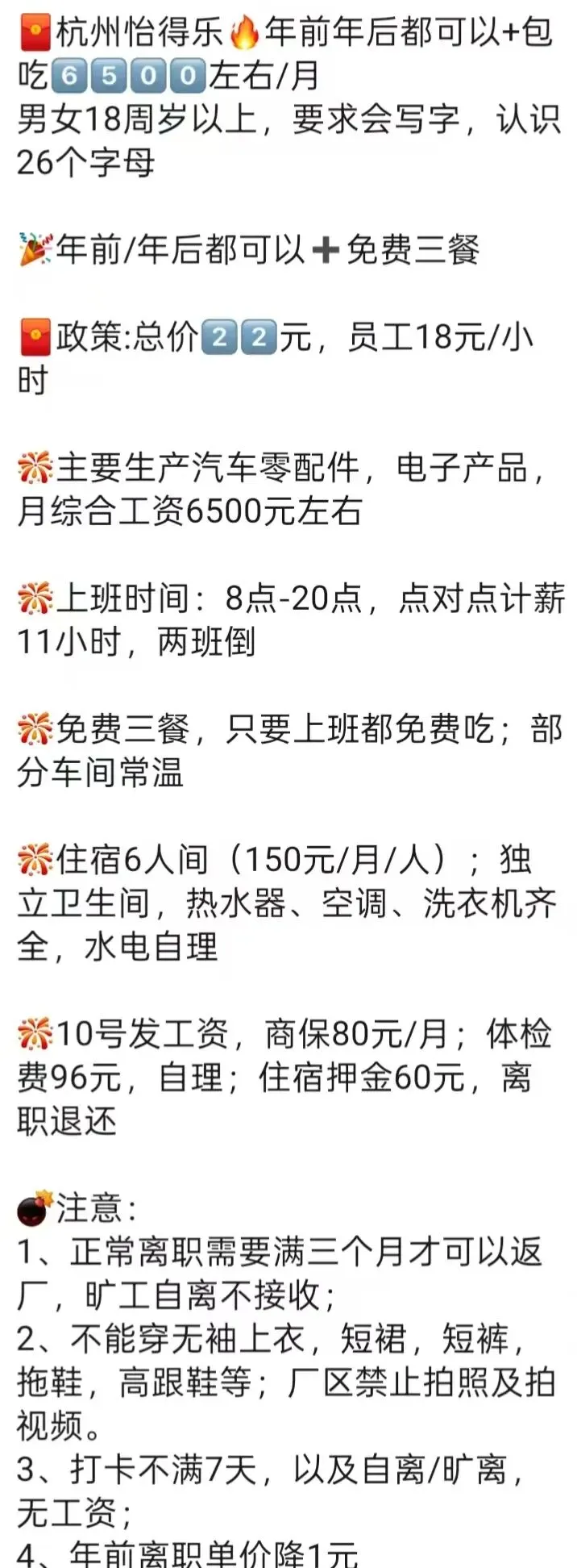 🍜食宿情况:免费工作餐(两荤两素两汤)➕免费住宿且不扣水电费、洗衣机、空调和热水器、6-8人间