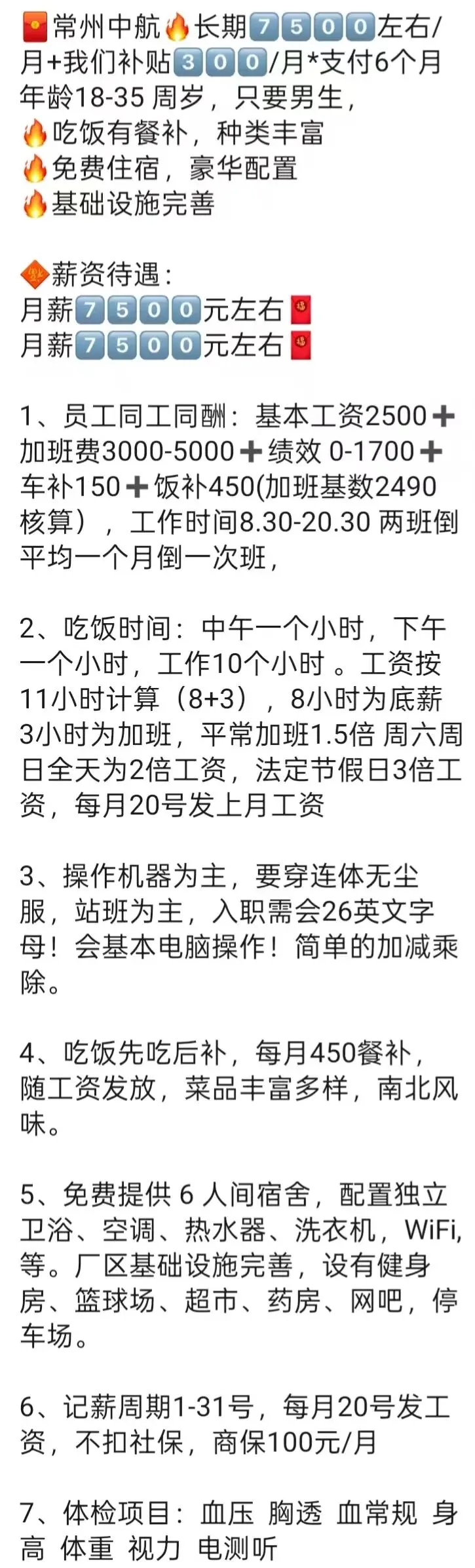 免费3餐!免费住宿!宿舍设备齐全!空调洗衣机均有。免费体检(工资中扣除30元)吃住在厂!商保80元/月。