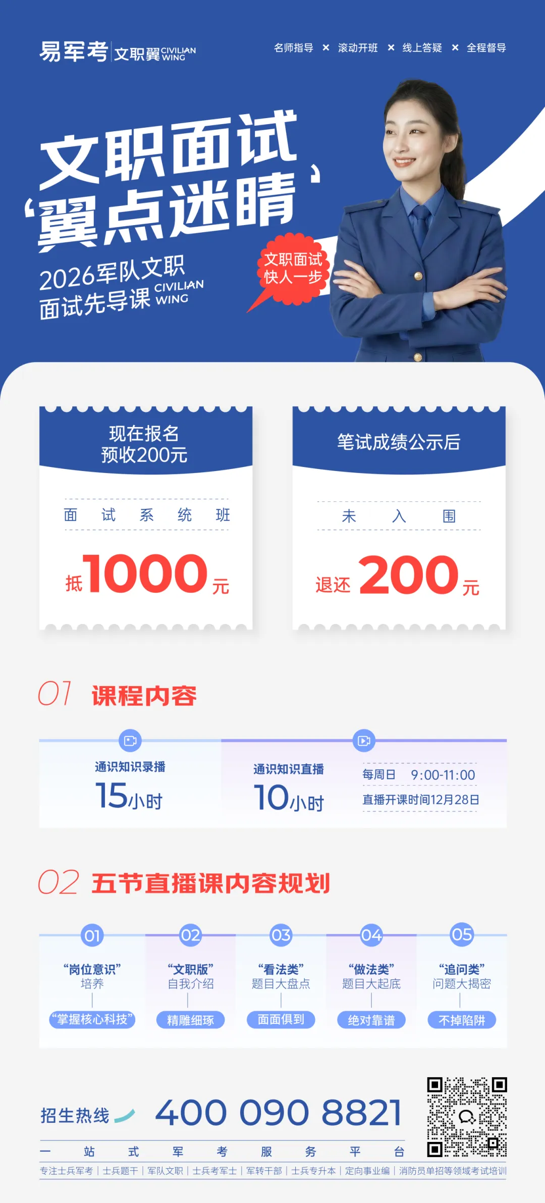 ✅ 零风险备战:预收200元,笔试未入围全额退。✅ 系统课程:含15小时录播+10小时直播,12月28日起系列精讲。✅ 专业指导:从岗位意识到题型盘点,助你精准避坑,面面俱到!