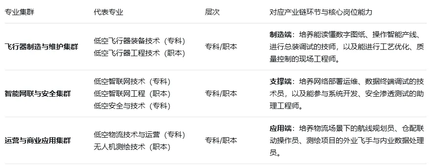 《2025年职业教育专业目录增补清单》清晰地指明了职业教育层面为低空经济输送技术技能型人才的方向。专业增补紧跟产业需求:清单中新增了多个直接对接低空产业链的专业。例如:装备制造大类-机电设备类新增“低空飞行器装备技术”(高职专科)和“低空飞行器工程技术”(职业本科)。