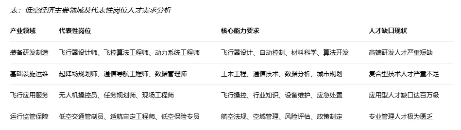 低空经济是指以各种有人驾驶和无人驾驶低空飞行器的低空(通常指真高1000米以下)飞行活动为牵引,辐射带动相关领域融合发展的综合性经济形态。其核心业态包括低空制造、低空飞行、低空保障和综合服务等,广泛应用于物流配送、载人交通、农林植保、应急救援、城市管理、文化娱乐等诸多领域。作为新质生产力的典型代表,低空经济是推动经济高质量发展、塑造新发展格局的重要引擎,对保障国家安全、提升国家治理能力现代化水平具有深远影响。全球主要国家纷纷将低空经济视为未来产业竞争的战略制高点,加大政策扶持与产业投入。1.2 人才是低空经济发展的第一资源