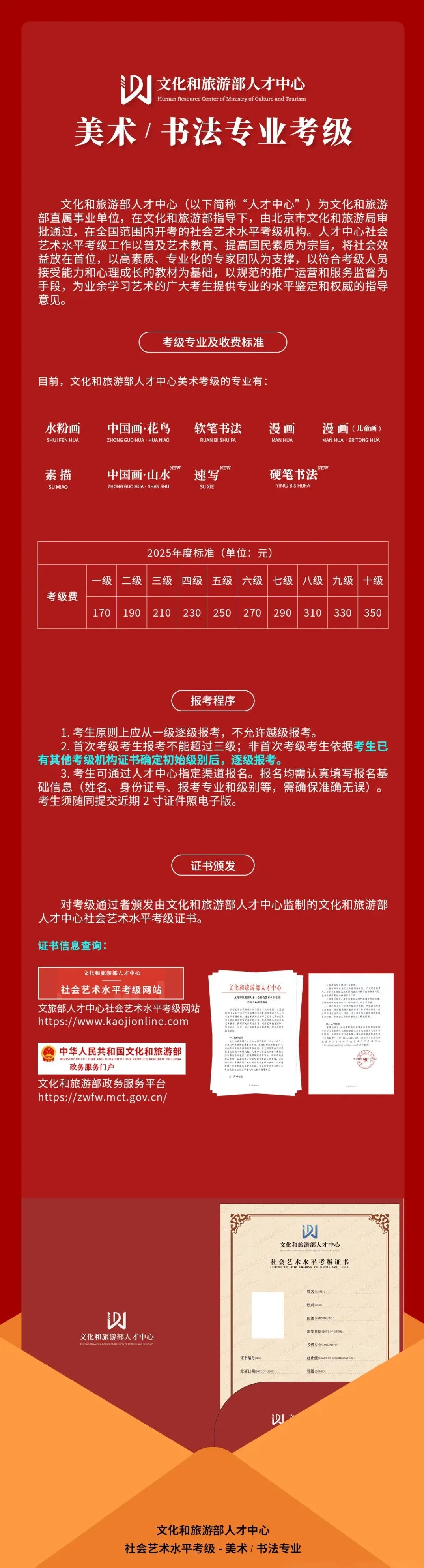 社会艺术水平考级工作在提升青少年美育素养、促进身心全面发展方面具有重要的推动和促进作用。人才中心美术专业社会艺术水平考级教材一律使用由文化和旅游部人才中心编著的《文化和旅游部人才中心社会艺术水平考级系列教材》——《漫画艺术考级教材》《中国画·花鸟艺术考级教材》《水粉画艺术考 级教材》《素描艺术考级教材》《软笔书法艺术考级教材》。考试、级别评分规 则及依据严格执行教材规定的“考级内容”“考级要求及形式”“考核测评标准”。