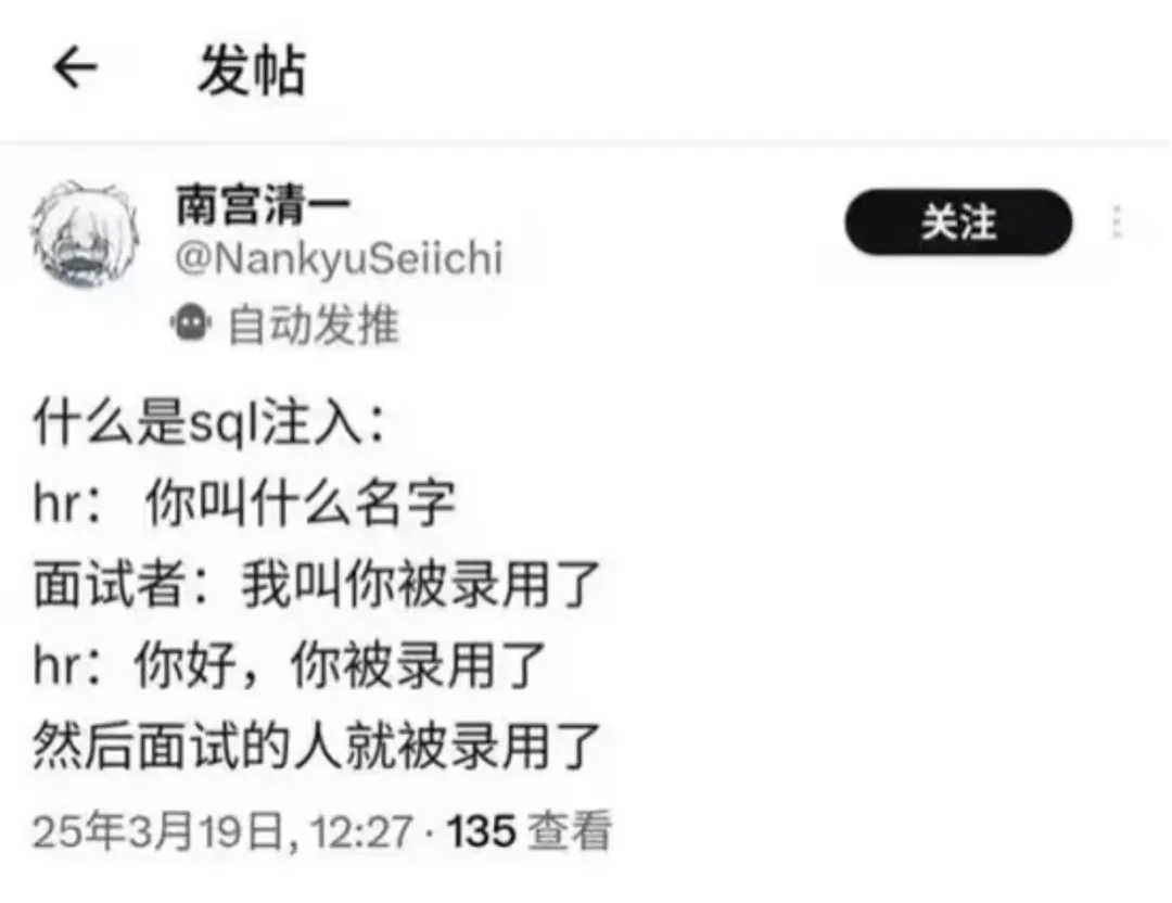 程序员都知道sql注入,就是通过sql漏洞执行代码: