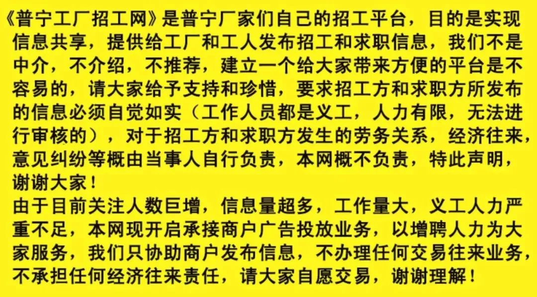 本男裤招聘:内包、扎前中、氨轮头、砍脚、四针六线、订布条、明巾头、穿标、包装、车间收发、排布工、仓库管理、生产文员、销售客服、财务文员联系电话:13687498534地址:普宁流沙秀湖路丁爽实业 |
