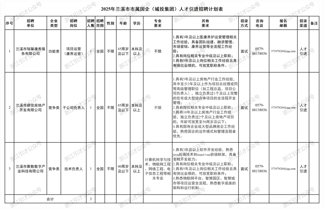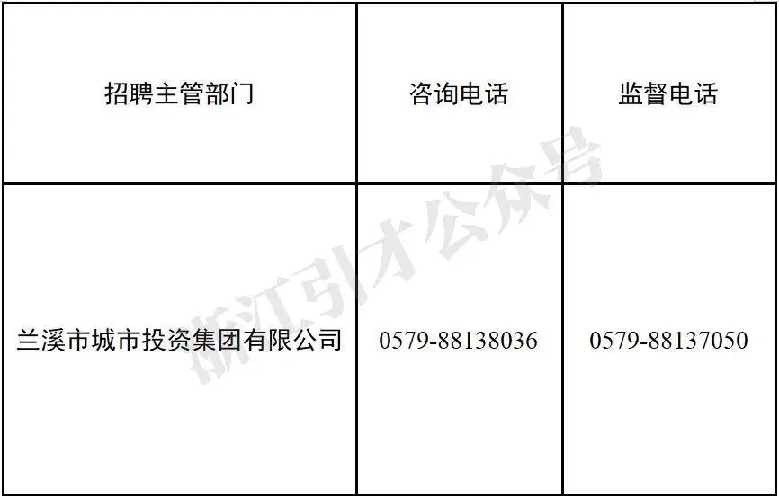 为深入实施人才强市战略,全面加强国有企业高素质人才队伍建设,兰溪市城投集团决定面向社会人才引进工作人员共3名(详见招聘计划表)。现将具体事项公告如下:1.遵纪守法,品行端正,愿意履行所在单位人员的义务;2.具有与招聘岗位要求相适应的学历、专业、技能条件;5.曾因犯罪受到刑事处罚的人员,曾被开除公职的人员,均不得报名。每人限报一个职位。现在全日制普通高校就读的专升本人员或研究生不能以原已取得的学历、学位证书报考。有法律、法规规定不得招聘情形的不得报考。报名人员将以下报名材料扫描后打包发送至报名邮箱(邮箱及咨询电话详见附件):1.下载并完整填写报名信息表(须附有一寸免冠彩色照片);4.毕业证书、学信网证明。留学人员应提供教育部中国留学服务中心出具的境外学历学位认证书;6.有工作经验要求的岗位需提供劳动合同(或工作证明)及基本养老历年参保证明。报名时间:2025年12月31日8:30-2026年1月18日17:30,逾期不可改报。时间:2026年1月4日8:30-1月19日17:30。应聘人员可上网查询资格审核结果及未通过审核的理由。需修改或补充报名资料的可在初审阶段重新提交。审核通过人数不足招聘计划数2倍,将核减或取消招聘计划。招聘计划取消的,应聘该计划人员可自接到取消计划通知起进行改报。逾期未改报的,视作放弃改报名。面试前对入围人员进行报名材料复核,由招聘单位(或主管部门)在规定时间、地点对入围面试人员现场进行报名材料复核。入围面试人员携带报名所需资料(材料、证明、证件)等原件及相应复印件一份。未按时参加或材料不符者,取消面试资格,不再递补。若岗位报名人数超过30人的,增加笔试环节。笔试成绩按1:3确定面试对象,笔试成绩不计入总成绩。面试成绩满分为100分,面试成绩未达到70分的取消录取资格。涉及成绩计算的,四舍五入保留2位小数。体检标准参照国家公务员的体检标准执行。按1:1的比例进行体检,放弃体检或体检不合格的,从该职位总成绩高分到低分依次予以递补。报考人员放弃体检的,视作放弃录取资格。体检合格人员按1:1的比例进入考察,放弃考察或考察不合格的,从该职位总成绩高分到低分依次予以递补。考察标准参照国家公务员的有关考察规定执行。考察合格后,向社会公示5个工作日,公示无异议的,按规定办理聘用手续。公示发布期结束后一个月内未办理入职手续的,作自动放弃处理,取消聘用资格。为确保招聘质量,经研究确无合适人选的,岗位可空缺。1.招聘范围根据《2025年兰溪市市属国企(城投集团)人才引进招聘计划表》上的规定。2.年龄、计算工作经历的截止时间为公告发布之日止。在全日制学校就读期间参加社会实践、实习、兼职等不能作为工作经历。招聘条件中有工作经历要求的,均以劳动合同(工作证明)和社保缴纳记录为审核依据。3.报考人员在报名资格审查中提交的所有材料应当真实、准确、有效。凡提供虚假信息和材料获取报考资格的,或有意隐瞒本人真实情况的,从招聘到使用进行全过程管理,一经查实,即取消录用资格和解聘,并纳入个人征信系统。4.出现体检、考察放弃或不合格、拟聘用公示前放弃录用资格以及在规定时间内未办理入职手续等情形时,招聘单位可由同岗位综合成绩从高分到低分排名次一名的考生依次递补。如无合适人选的,该岗位可以空缺。 5.应聘人员须确保本人报名登记的手机畅通,凡因通信不畅造成的后果由应聘人员自负。有关面试结果等事项的通知,请应聘人员及时关注兰溪人才网。(一)本次公开招聘有关信息指定在兰溪人才网(http://www.lxrcsc.net,电话:0579-89010200)公布,供考生查询和社会监督。考生报名后请及时上网查询有关通知,请考生自行留意。(二)对招聘工作及相关信息有异议的,请在信息公布之日起5日内书面向相应招聘主管部门反映,以便及时研究处理,逾期不受理。(三)对考试违纪违规行为的认定和处理,按照《浙江省人事考试应试人员违纪违规行为处理规定》执行。1.2025年兰溪市市属国企(城投集团)人才引进招聘计划表