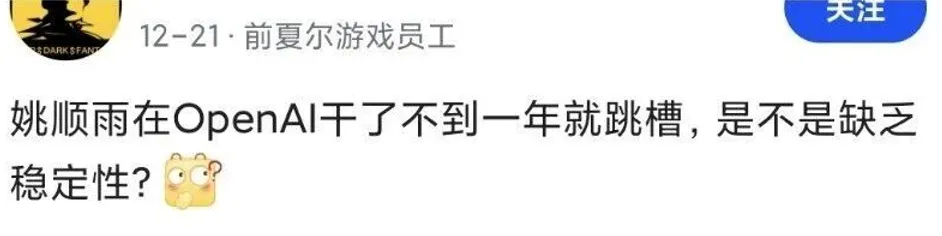 前两天在社交平台刷到一条热搜,说姚顺雨在OpenAI干了不到一年就跳槽,是不是缺乏稳定性。底下评论区瞬间炸了锅,一条获得上万点赞的神评论:”人家跳槽那叫反映人往高处走的冲天之志,而你跳槽?那说明能力不足呗。”