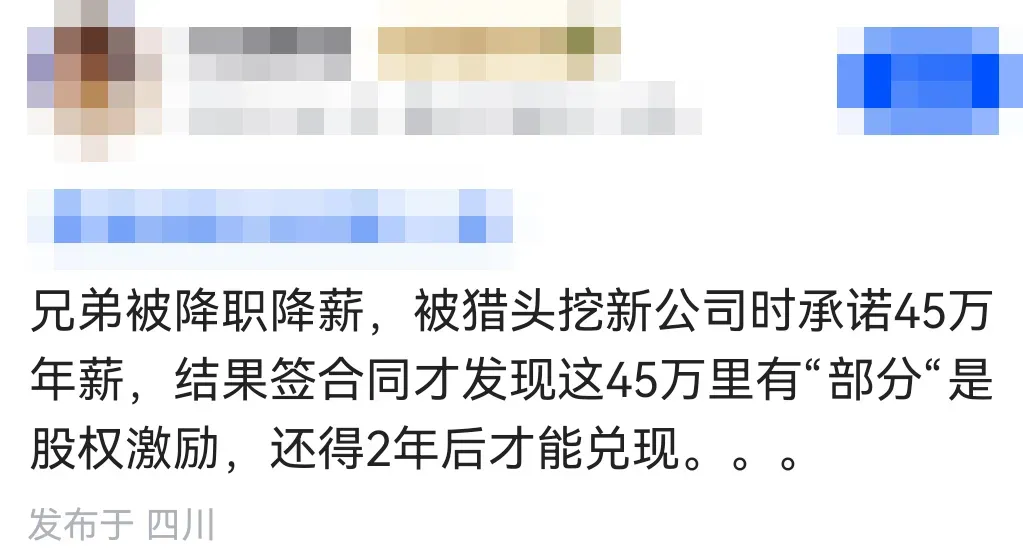 兄弟被降职降薪,被猎头挖新公司时承诺45万年薪,结果签合同才发现这45万里有“部分“是股权激励,还得2年后才能兑现...