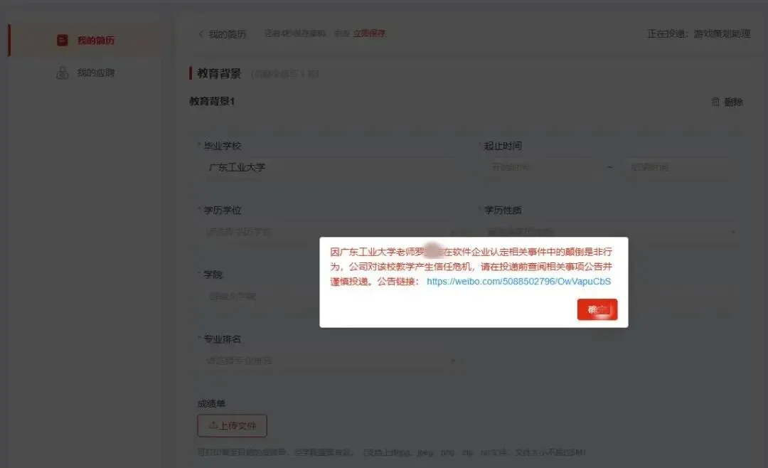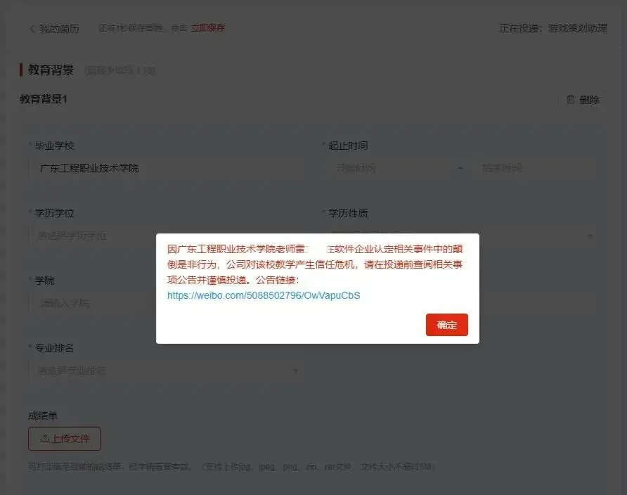 据极目新闻,除广东工业大学外,广东工程职业技术学院也被该公司拉入招聘黑名单。该公司的招聘网页称“因广东工程职业技术学院xxx在软件企业认定相关事件中的颠倒是非行为,已被系统列入黑名单,无法投递简历”。