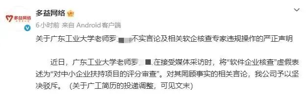 广州多益网络股份有限公司官方微博10日,发布“关于广东工业大学老师罗xx不实言论及相关软企核查专家违规操作的严正声明”,声明中称,近日,广东工业大学老师罗xx在接受媒体采访时,将“软件企业核查”虚假表述为“对中小企业扶持项目的评分审查”。对其罔顾事实的相关言论,我公司予以坚决驳斥。