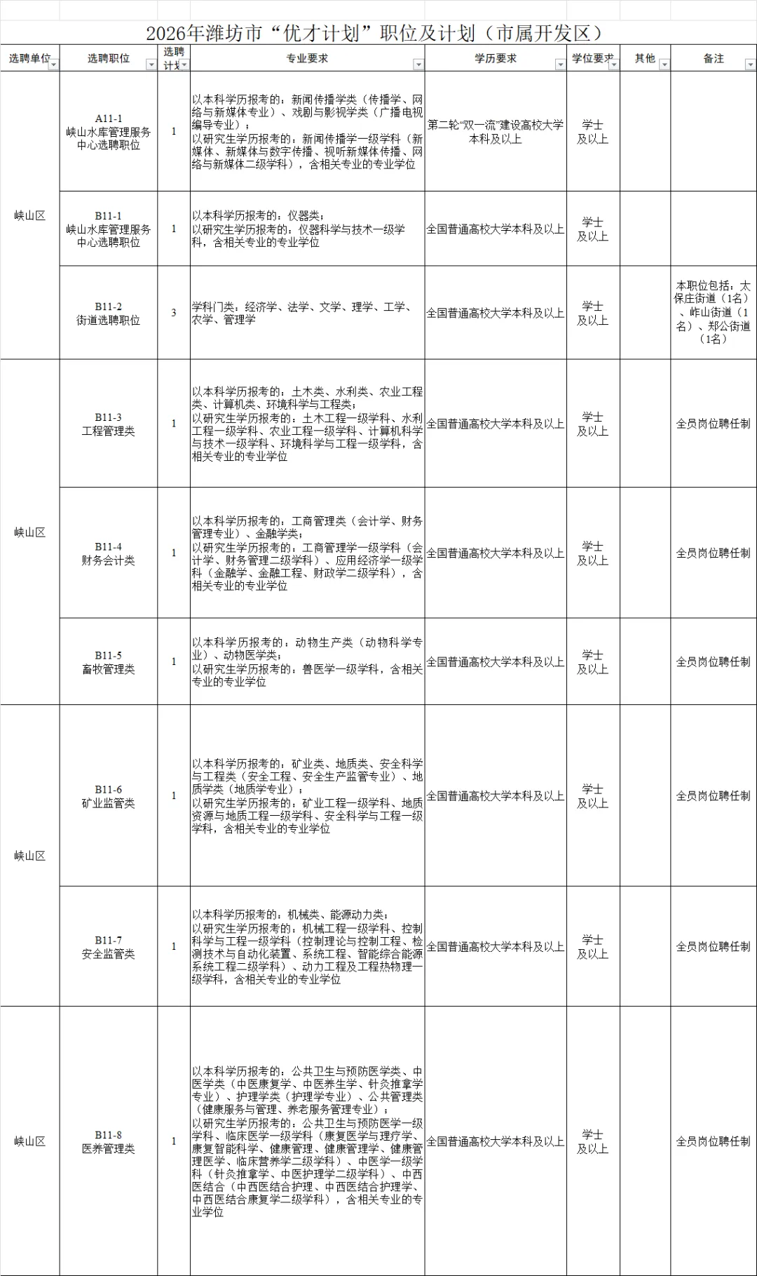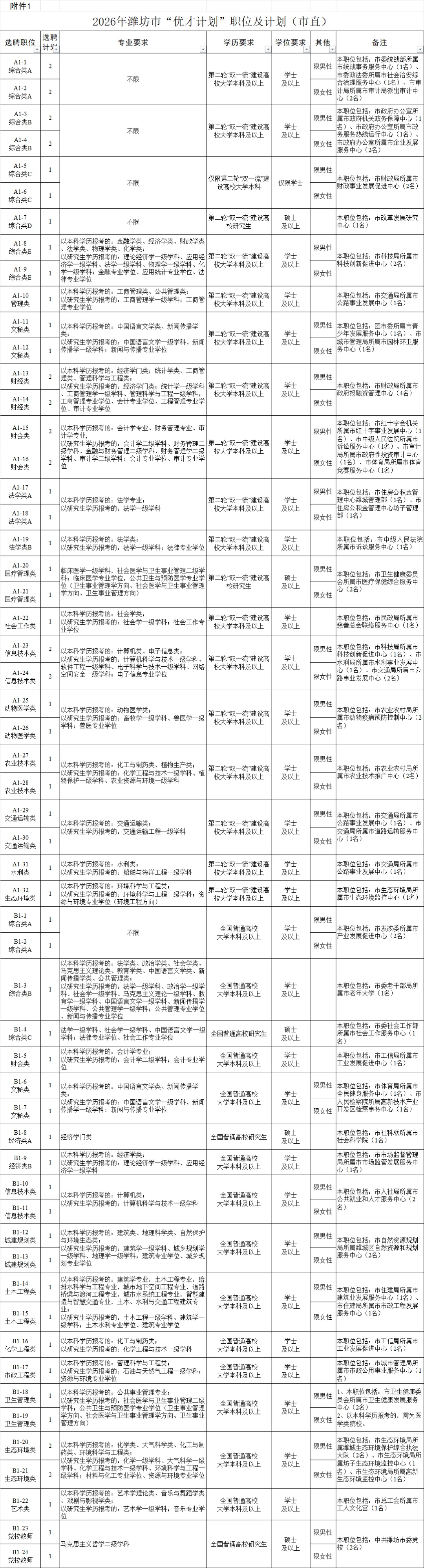 为加快建设实力强品质优生活美的更好潍坊,加强青年优秀干部人才储备,潍坊市决定组织实施2026年“青年优秀人才选聘计划”(简称“优才计划”),公开选聘一批优秀毕业生。现将有关事项公告如下: