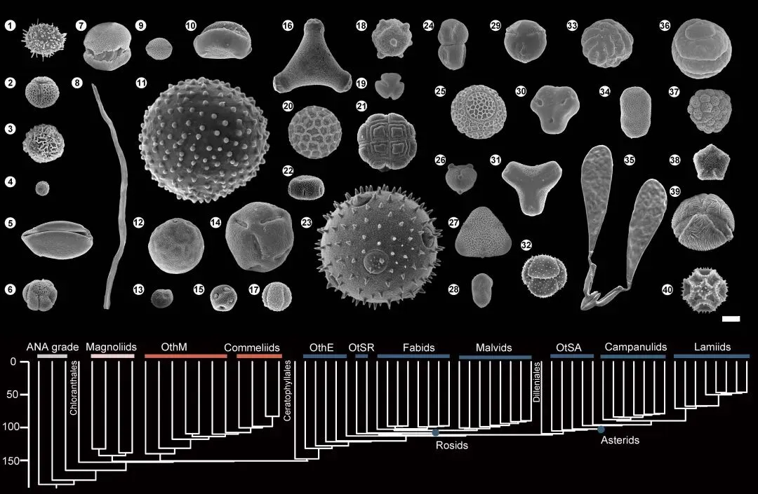 在进化生物学中,厘清生命之树上形态多样性的起源与演化规律始终是一项核心挑战。花粉作为被子植物多细胞单倍体阶段的重要组成部分,虽仅在授粉过程中短暂存在,却展现出惊人的外壁结构变异。这些精细构造不仅是自然界中最复杂的微观形态之一,更代表了植物适应陆地环境的关键策略。自植物登陆以来,利用孢粉素加固配子体外壁,不仅提升了其在干旱等严酷条件下的生存能力,也赋予了花粉极佳的化石保存潜力。因此,正如动物骨骼形态能揭示其演化历程一样,花粉的形态演化同样为我们理解多细胞生命在陆地上的辐射过程提供了不可替代的微观证据。