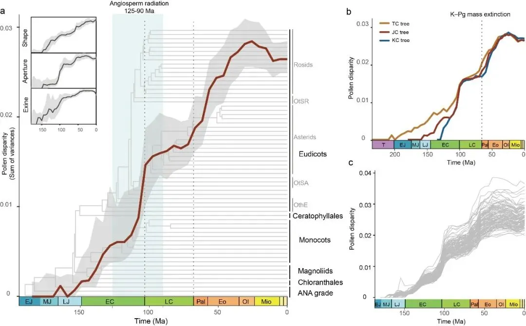 尤为引人注目的是,花粉形态多样性的积累并非线性增长,也未局限于起源初期的一次性爆发,而是经历了两次显著的“脉冲式”跃升。无论采用何种冠群被子植物起源年龄假说,这一模式均保持稳健。第一次脉冲发生在白垩纪中期,紧随早期被子植物花粉形态相对单调的阶段之后,其快速多样化很可能正是达尔文所困惑的“讨厌之谜”背后的演化真相。第二次脉冲则出现在白垩纪-古近纪(K-Pg)大灭绝事件之后——随着恐龙时代的终结和全球森林系统的崩溃,气候剧烈波动与植被重组为被子植物创造了新的生态机遇,促使其再次迸发出形态创新的高峰。这两次脉冲共同说明,被子植物不仅具备内在的形态可塑性,更能敏锐响应外部环境剧变,持续开拓新的演化路径。