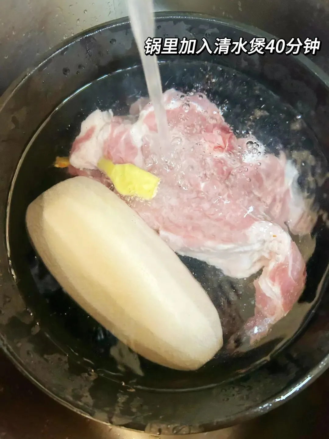 做法:1/3个白萝卜,3片生姜(或带须葱白)一起放入锅中,加水煮5-10分钟。