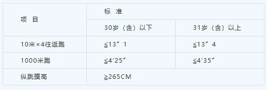 体能测评包括三个项目,分别为纵跳摸高、10米×4往返跑、1000米跑,每个项目测试次数不超过2次。体能测评采用达标制,任意一项不达标的,即为体能测评不合格,不进入下一环节。体能测评不设缓测、补测,达标标准详见下表。