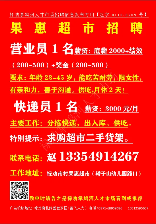 【禄武招聘】禄劝掌鸠河人才市场本地招聘第11期(关注公众号查询更多岗位)