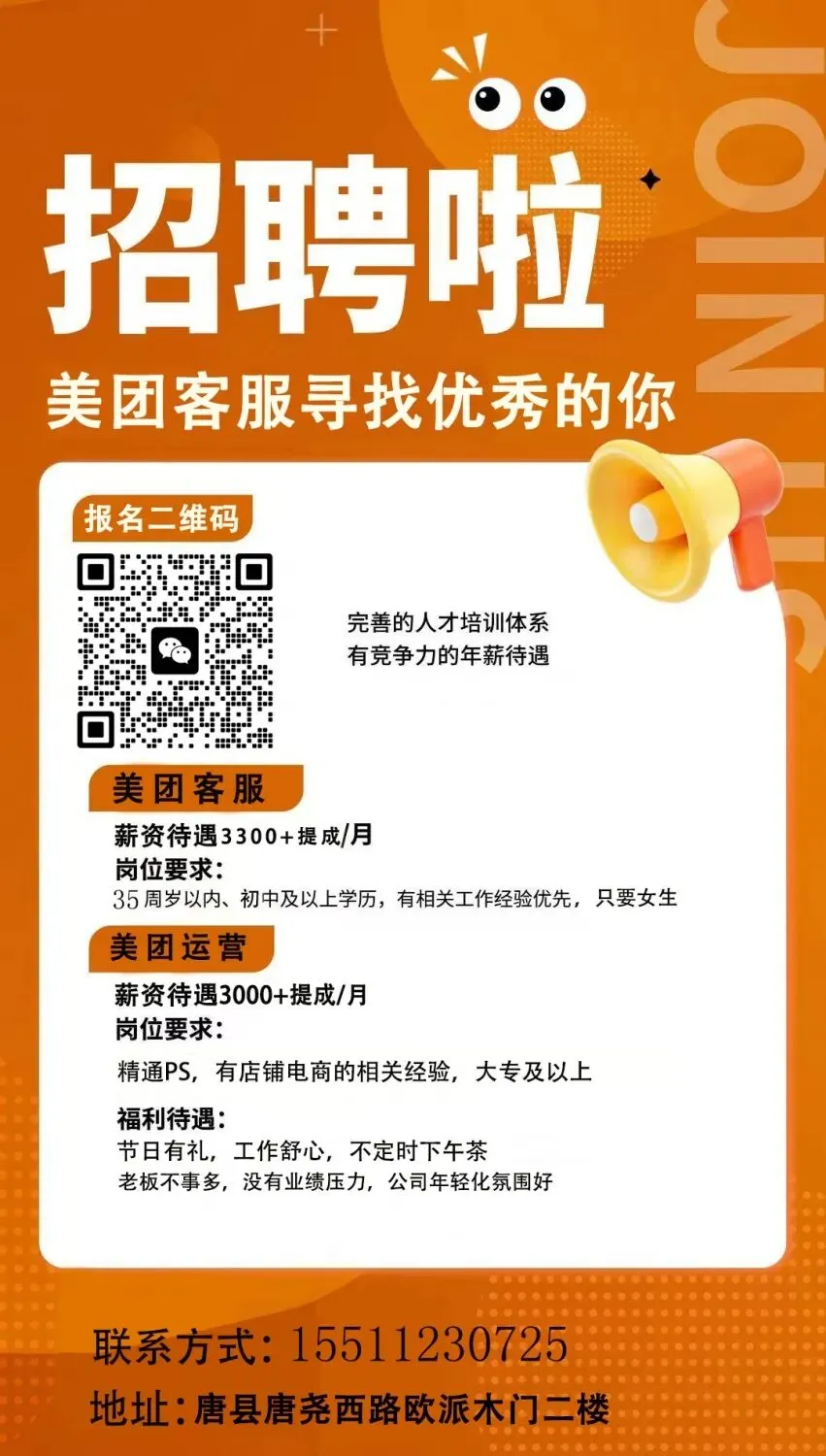 工作地址:唐县中山南大街全兴加油站南行20 米美团外卖2楼办公室