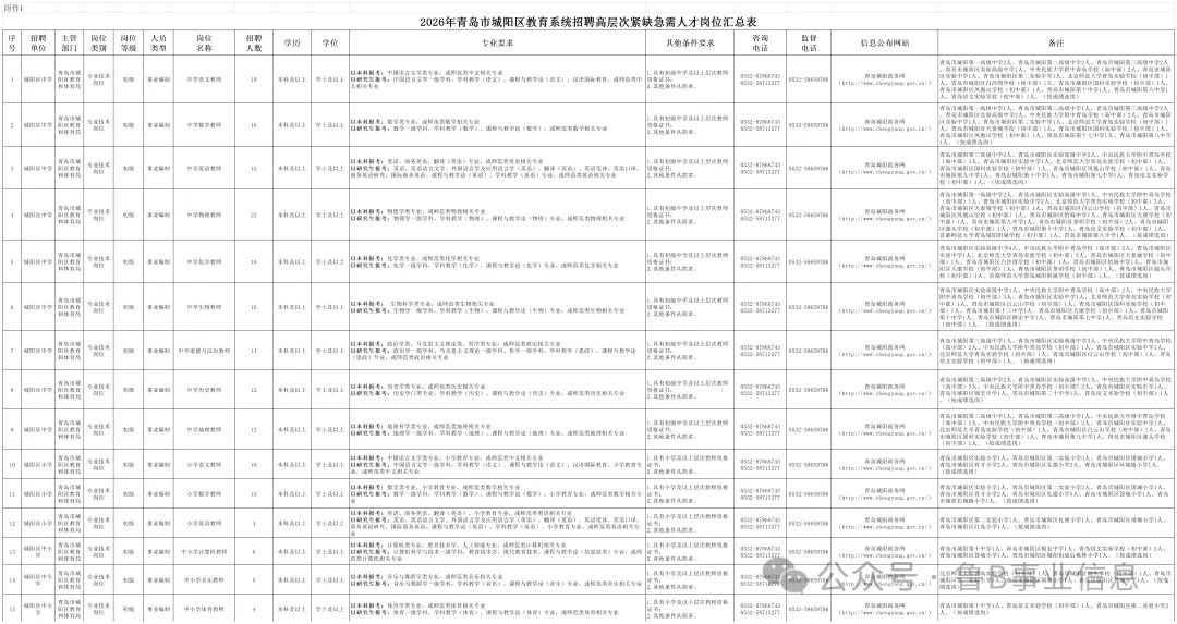 附件:1.2026年青岛市城阳区教育系统招聘高层次紧缺急需人才岗位汇总表