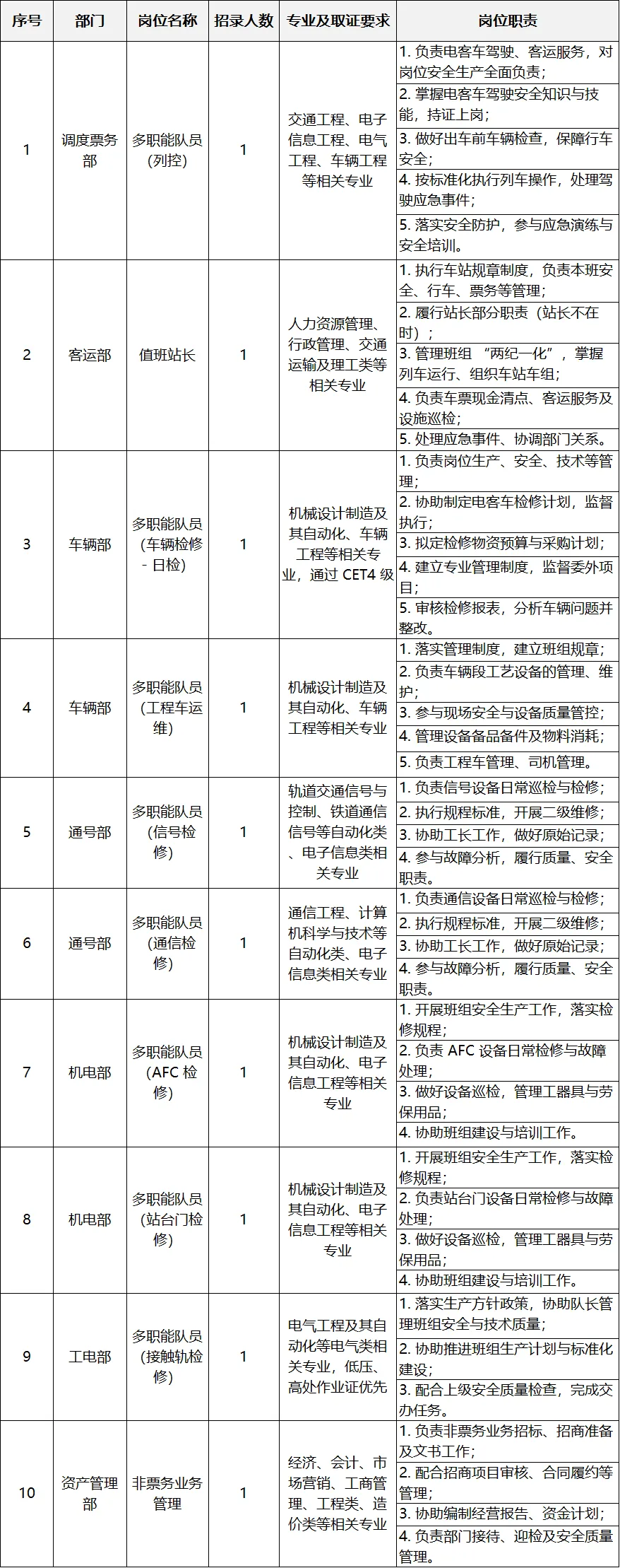 本次计划招录10人,将按照梯度化培养实现人员从基层生产岗位至目标管理岗位的稳步过渡,具体招录岗位详见表格。
