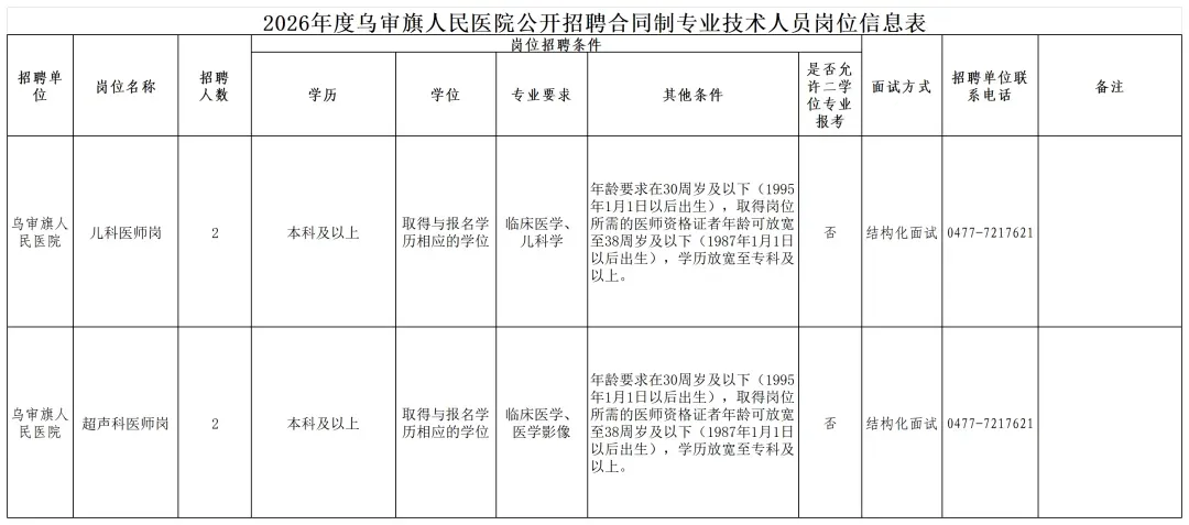 乌审旗人民医院(乌审旗医共体总医院)是一所集医疗、教学、科研、预防和康复于一体的综合性二级甲等公立医院,医院占地面积为95000㎡,建筑40000㎡。先后被授予“爱婴医院”、“健康促进医院”、“健康单位”、“文明单位”、“民族团结示范单位”等荣誉称号,是北京清华大学附属清华长庚医院“十四五”期间对口协作医院、是“北京清华长庚医院博士工作站”,是“中日友好医院医联体”“解放军总医院远程医学中心”“国家心血管中心高血压专病医联体”、“内蒙古神经外科专科联盟”“内蒙古医科大学附属医院高层医疗协同体”等权威医学联盟成员单位。本次面向社会公开招聘专业技术人员4名。具体岗位、条件等详见附件《乌审旗人民医院公开招聘合同制专业技术人员岗位信息表》(以下简称《岗位表》)。1.具有中华人民共和国国籍,遵守宪法和法律,具有良好的政治素质和道德品行。2.年龄要求在18周岁以上,30周岁及以下(1995年1月1日以后出生),有医师资格证者年龄可放宽至38周岁及以下(1987年1月1日以后出生)。乌审旗卫生健康系统正式聘用人员。现役军人;在读的本科、研究生(不含2026年应届毕业生);曾因犯罪受过刑事处罚和曾被开除公职的人员,被依法列为失信联合惩戒对象的人员;在公务员招考或事业单位公开招聘中被认定有舞弊等严重违反录用、聘用纪律行为并在禁考期限内的人员;法律法规规定不得聘用为事业单位工作人员的其他情形的人员。本次公开招聘工作按照编制招聘计划、发布招聘公告、网上报名、资格初审、笔试或面试、资格复审、体检与考察、拟聘用人员公示、办理聘用手续等程序步骤进行。1.报名方式:应聘人员请将报名表(见附件)、个人简历、毕业证、学位证书、《教育部学历证书电子注册备案表》,以及与报考岗位要求的相关证书扫描成一个PDF文件发送至wyk210014@qq.com报名邮箱(邮件以“应聘岗位+专业+应聘人员姓名”命名)。考生须对提交材料的真实性负责,凡弄虚作假者,一经查实,即取消报名、考试等资格。2.报名时间:2026年1月8日至2026年1月15日17:00。3.资格初审:报名期间,资格初审通过后,报考岗位不能更改。报名结束后,未进行资格初审或未通过资格初审的,不能再修改报名信息或改报其他岗位。4.应聘人员应正确填写联系方式并保持手机畅通,因应聘人员通讯不畅所造成的后果,由应聘人员本人负责。5.本次招聘以面试考察形式进行,当某一岗位资格初审通过人数大于20人时,此岗位增加笔试环节,具体笔试事宜另行通知。1.根据报考专业岗位要求,采取结构化面试的方式进行,主要考察应聘者的基本能力、专业素质和岗位适宜度,面试用国家通用语言作答,对不按要求作答的,按零分处理。面试成绩满分为100分,成绩保留两位小数。面试成绩当场公布。2.面试时间、地点及其它事宜通过“乌审旗人民医院订阅号”、“乌审旗人民医院”微信公众号或手机短信等形式另行通知。1.本次招聘资格复审时间与面试同一天进行,资格复审工作由乌审旗人民医院组织实施。未按规定时间参加资格复审的视为自动放弃面试资格。2进入面试范围的应聘人员,请持报名表,身份证、毕业证和学位证书原件及复印件、教育部学历证书电子注册备案表、执业证书等应聘岗位要求的有关证件和证明原件及复印件参加资格复审。3.资格复审将重点审核考生所填报的信息是否真实准确;凡所填报个人信息与所持证件不符、隐瞒在读大学生或研究生等真实身份以及提供虚假个人信息,不符合报考条件的,一律取消面试资格。1.按照每个岗位应聘人员面试成绩由高到低的顺序和该岗位实际招聘计划数,等额确定进入体检和考察范围的人选。同一岗位进入体检考察范围的人员最后一名考试总成绩出现并列的,具有优先条件者进入(本科及以上学历优先,学历相同的主治医师及以上职称优先),条件相同的,组织加试(加试形式由医院根据实际情况确定),以加试成绩高低排序,等额确定进入体检和考察范围的人选。体检参照公务员录用体检有关规定执行。体检工作应在面试成绩公布后一个月内完成。考生无正当理由不按时参加体检、体检不合格、在体检过程中弄虚作假致使体检结果失真的,取消其聘用资格,按照考试成绩由高到低等额递补。体检工作结束后按照等额确定进入考察范围人选。3.考察工作由乌审旗人民医院按照有关规定和要求组织实施。按照德才兼备的标准,根据拟聘用岗位要求,全面、准确、客观的评价被考核对象的综合素质,对考察不合格的或自动放弃的考生取消其聘用资格,按照考试总成绩由高到低等额递补。4.体检、考察阶段因个人原因放弃的,按照考试成绩由高到低等额递补。1.乌审旗人民医院根据应聘人员的考试成绩以及体检和考察结果确定拟聘用人员。拟聘用人员在乌审旗人民医院微信公众号进行公示。公示期间接受社会监督举报,期限为7日。2.拟聘用人员应在规定时间内报到,否则视为自动放弃,取消其聘用资格,造成岗位空缺,经考务工作领导小组会议研究决定后依次递补。3.乌审旗人民医院与拟聘人员签订聘用合同。试用期为6个月,试用期包括在聘用合同期限内,试用期满考核合格的,办理合同制聘用手续;试用期间主动离职或试用期不合格的,取消聘用,所空缺岗位可由乌审旗人民医院招聘工作领导小组根