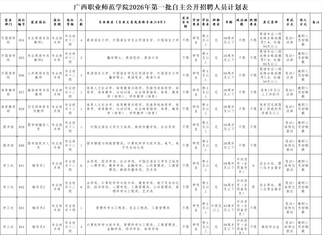 广西职业师范学院2026年第一批自主公开招聘人员公告