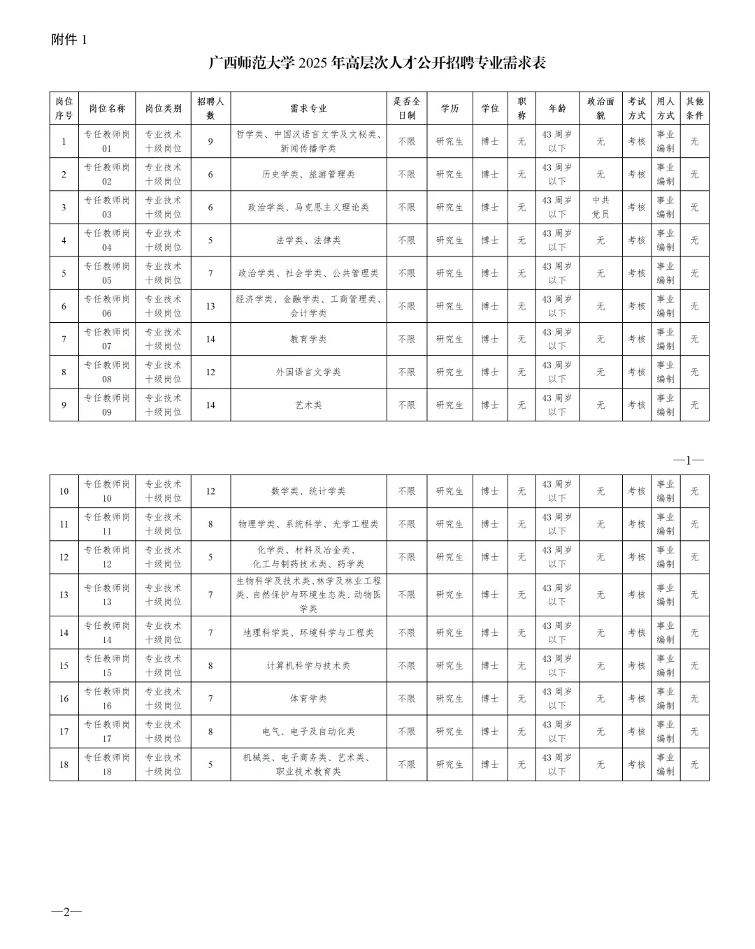 附件1:广西师范大学2025年高层次人才公开招聘专业需求表.doc