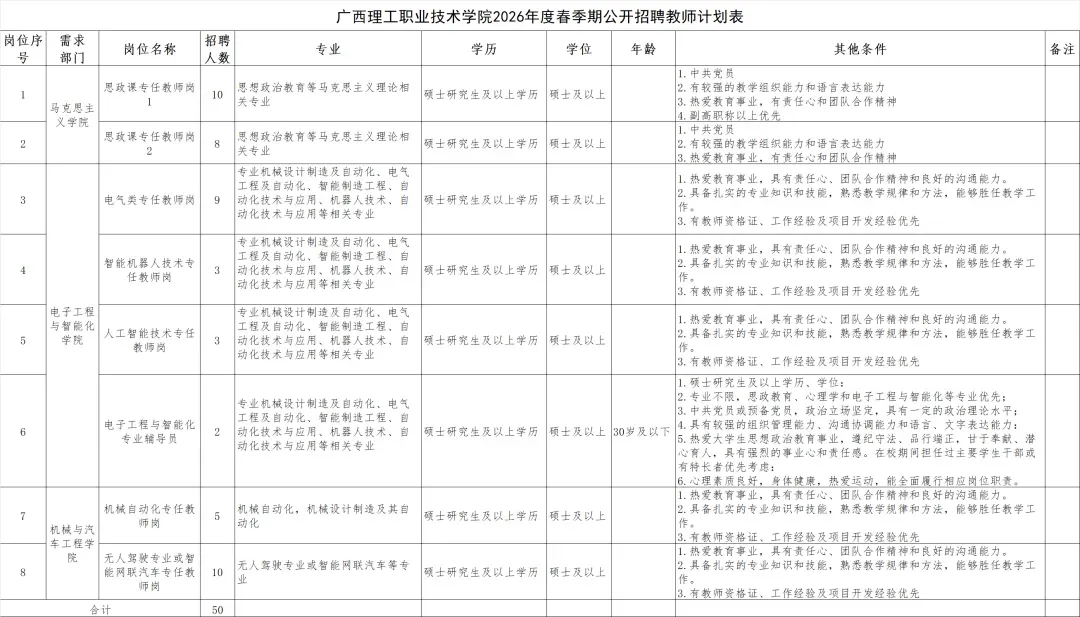 广西理工职业技术学院2026年春季学期招聘教师公告