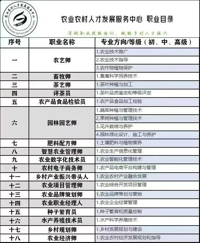 农艺师、畜牧师、园艺师、茶艺师、农产品食品检验员、肥料配方师、乡村规划师、乡村产业振兴带头人、农村电子商务师、智慧农业管理师、种子繁育员