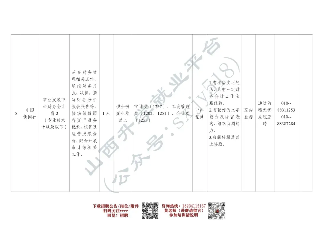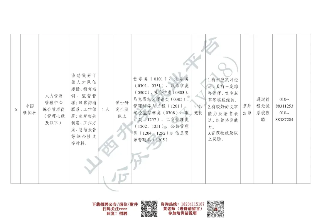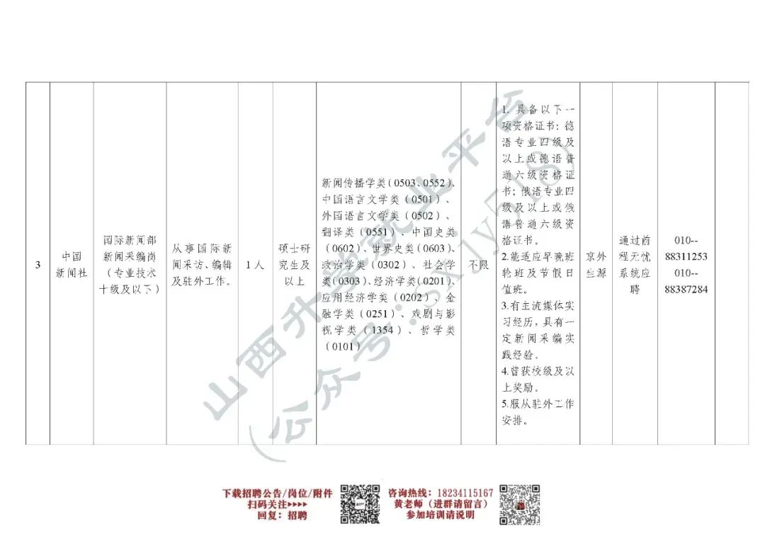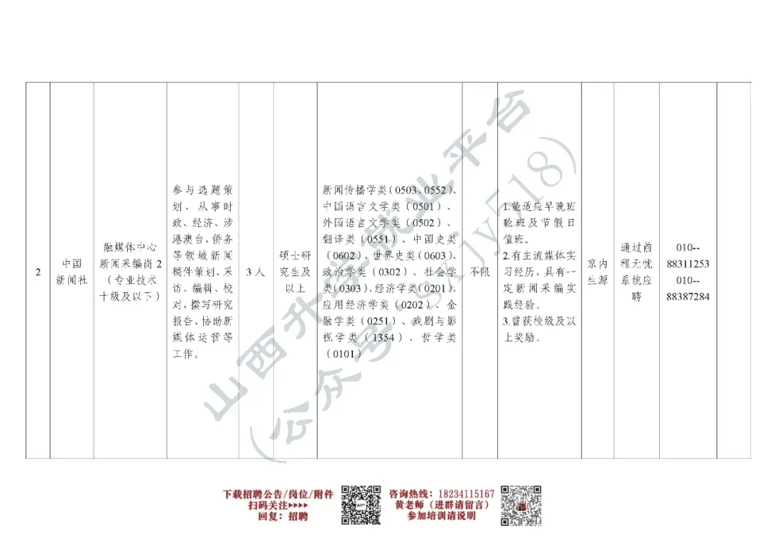 此次招聘涉及6个岗位、计划招聘11人,具体岗位及资格条件详见《中国新闻社2026年度公开招聘岗位信息表》。其中,有关岗位专业条件参考教育部公布的《授予博士、硕士学位和培养研究生的学科、专业目录》。